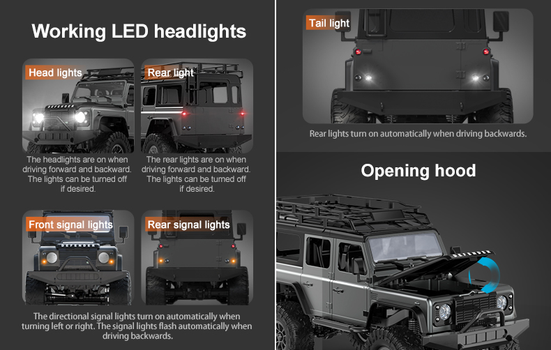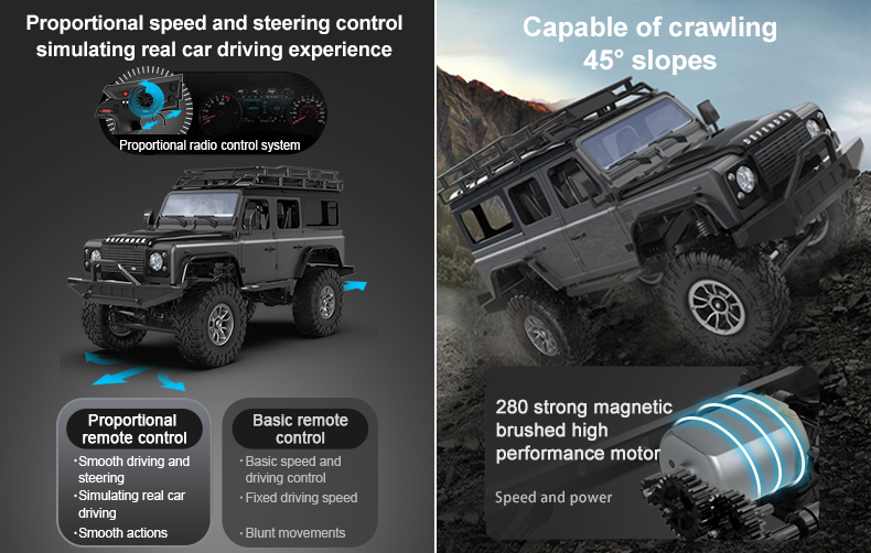 Double E ロッククローラーモデルは、優れたパフォーマンスと Land Rover Defender のクラシックな形状を組み合わせて、素晴らしいリモートコントロールモデルを作成します。4x4 ドライブシステムは、280 個のブラシ付きモーターと高トルクサーボで駆動され、あらゆる種類の地形で優れた運転とステアリング体験を提供します。リモートコントロールは、操作が簡単な比例システムを備えています。また、スロットルとステアリングトリムが付いているので、速度とステアリング角度をリモートで調整できます。調整可能な金属製ホイールベースは、4輪独立合金サスペンションシステムを備えた耐久性のあるシャーシに設定されています。ロッククローラーには、簡単に取り外して交換できる高グリップ TPR チューブレスタイヤが装備されています。E 339 RC トラックは、リモートでオン/オフを切り替えることができる照明システムを備えており、よりリアルなプレイ体験を提供します。