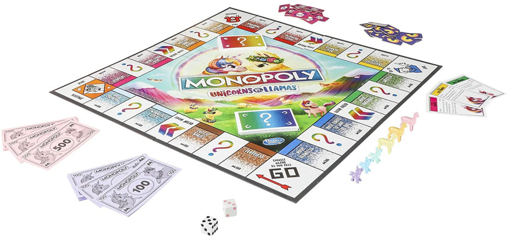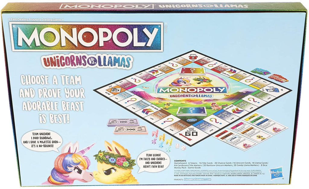 - 8歳以上向けの楽しいボードゲーム:モノポリーのユニコーン対ラマのゲームは、これらの愛らしい生き物の競争を盛り上げます。プレイヤーは、自分の毛皮で覆われた友達が最高であることを証明しようとして、大いに楽しむことができます。