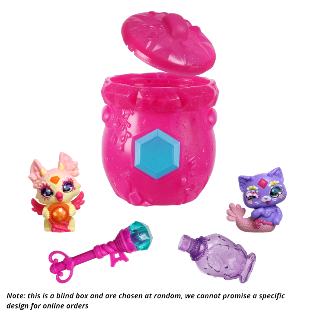 魔法の「泡と明かす」2パックの大釜で、どんなミックスリングを作りますか? 2つのミックスリングが入ったこの特別な2パックで魔法を2倍にしましょう。そのうちの1つには珍しいミックスリングが含まれています! コレクターズ大釜の蓋を開けて、魔法の材料を見つけてください。 混ぜて泡と発泡を見ることができます! 魔法の言葉「マジカス ミクサス」を言って、魔法のミックスリングと杖を明かしてください! クリスタル ウッズから、お子様がロックを解除できる新しい魔法の力が5つあります。 クリスタル ウッズの各ミックスリングには、お子様が付属の杖を使用するとアクティブになる特別な魔法の力があります。 お子様は暗闇で魔法のように光るグローリングや、もうすぐ受け取る幸運を明かすラッキングリングを見つけるでしょうか? 素晴らしい髪のロキシーを見つけるでしょうか? 色が変わるアクア チャンジャスや、天使の羽を現して空高く舞い上がるフラッターフライヤーを見つけるかもしれません!もしかしたら、あなたのお子様が限定版のミキシング「Shymma」を見つけるかもしれません。