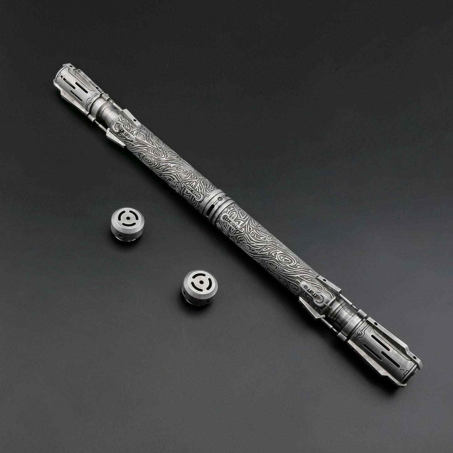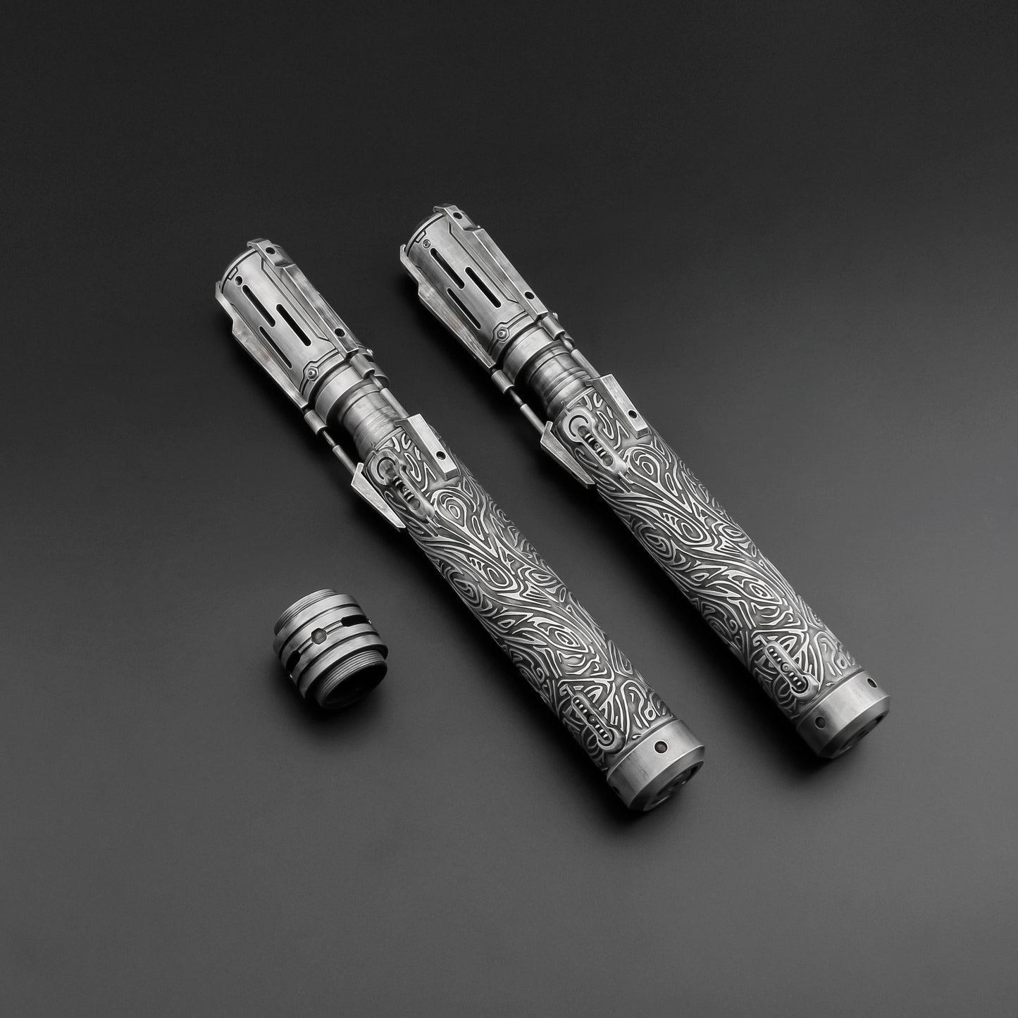 Satele Shan RGB/Neopixel ライトセーバーのパワーと精度を体験してください。グリップには精密でエレガントな彫刻模様が施され、シングルブレードまたはデュアルブレードから選択できます。中空のエミッターとユニークなデザインが、ジェダイにとって不可欠なこの武器に洗練された雰囲気を加えています。