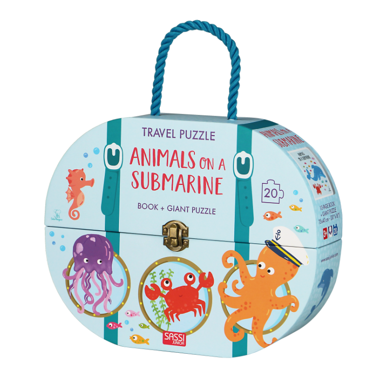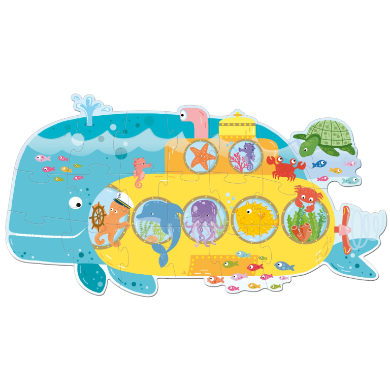 虹色に輝くディテールが施されたボックスには、10 ページの本、40 ピースのパズル、パズルの上に組み立てて配置する 10 個の形のフィギュアが入っています。これらのフィギュアを使って要素と単語を認識し、関連付けることを学びます。
