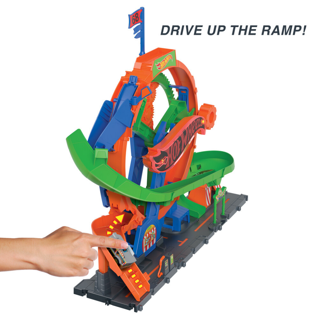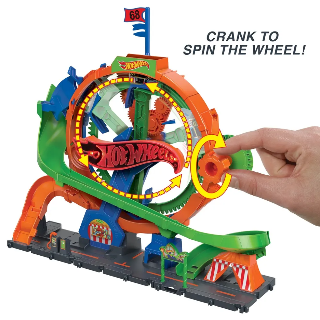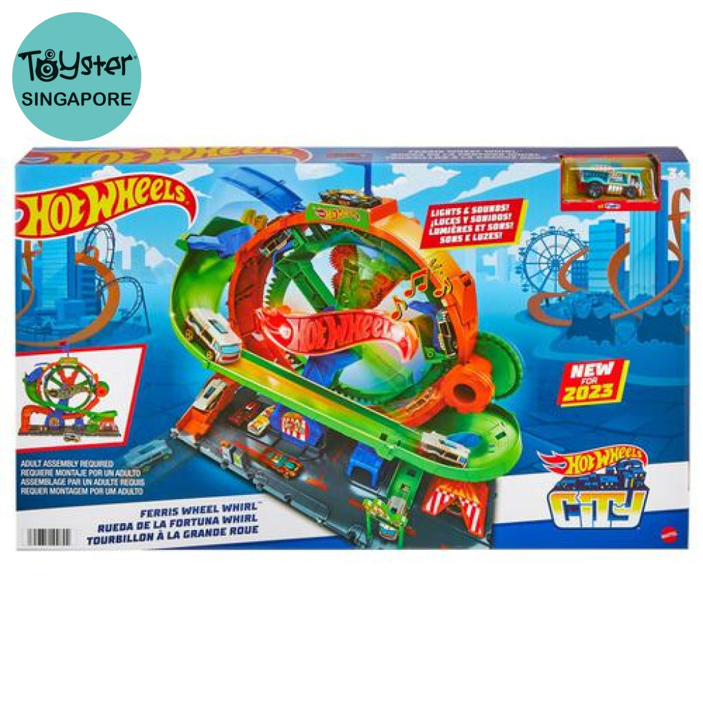 Hot Wheels™City Ferris Wheel Whirl™playset There are lights and sounds, a carnival and an amusement park. Drive up the ramp and turn the knob to make the Ferris wheel move. It automatically picks up the car and holds it until the kids twist the deflector to drop the car onto the field.