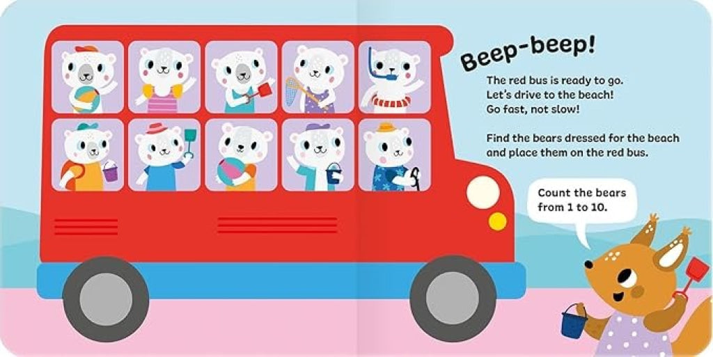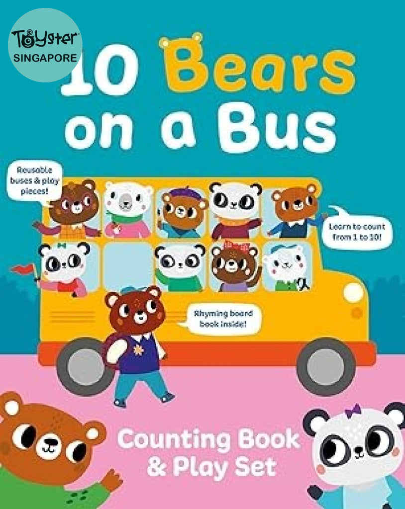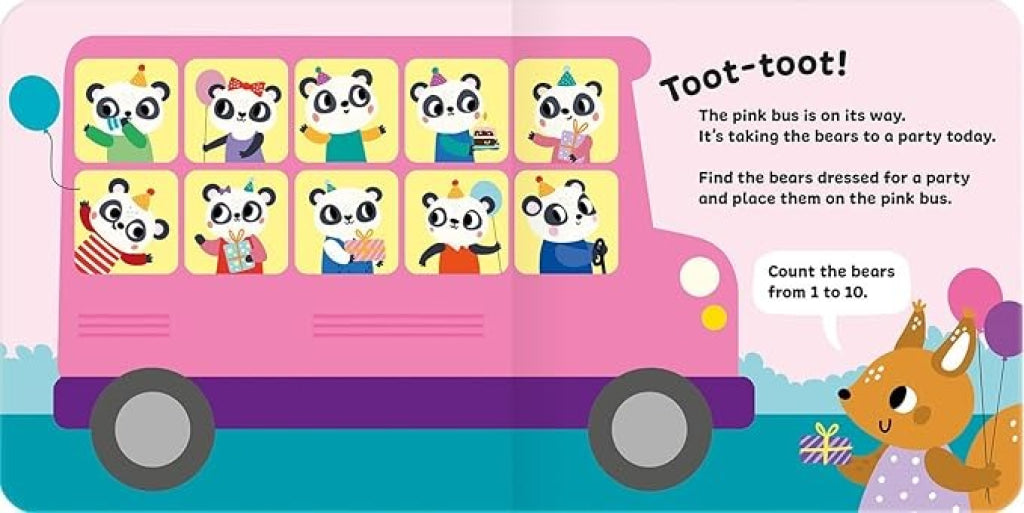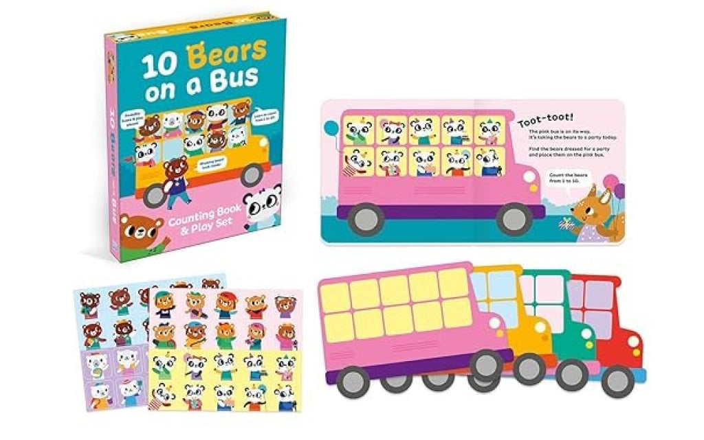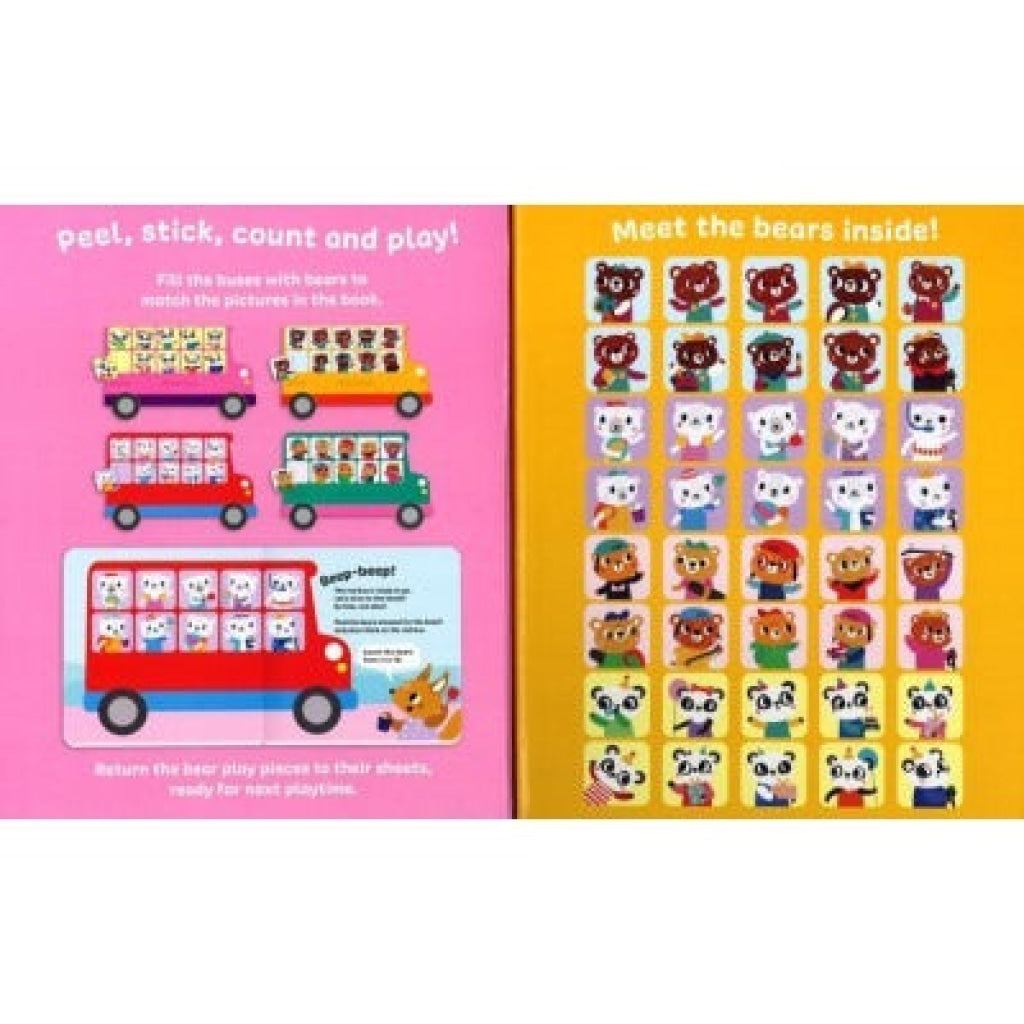 Toot-toot! All aboard the buses, bears 1 to 10!Discover four colourful bus playboards and 40 easy-peely reusable bear play pieces in this immersive count-and-play set. Read the 10-page rhyming board book to find out where the buses are going - from a party and the beach to school and the skatepark - and which 10 bears will travel on each one. Then, fill the buses with bears from 1 to 10 to match the pictures. Bears-on-a-bus counting fun on repeat!