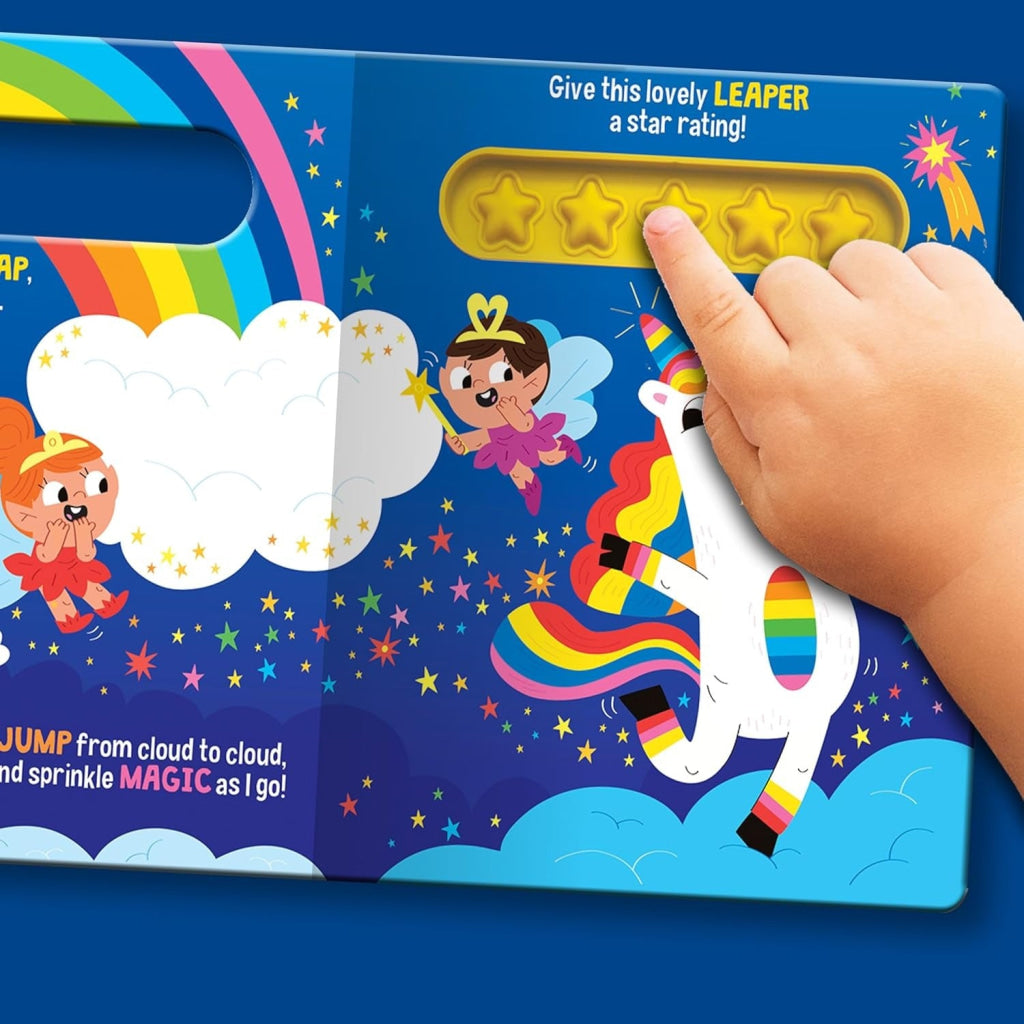 This interactive book is full of unicorns - clever unicorns, dancing unicorns, leaping unicorns, and speedy unicorns - and each one trying to show you that they are the sparkliest and greatest unicorn, ever! But which one is the sparkliest? YOU decide! Push, pop, and count the soft, silicone stars to rank each unicorn from 1 to 5, and choose the greatest unicorn of them all.