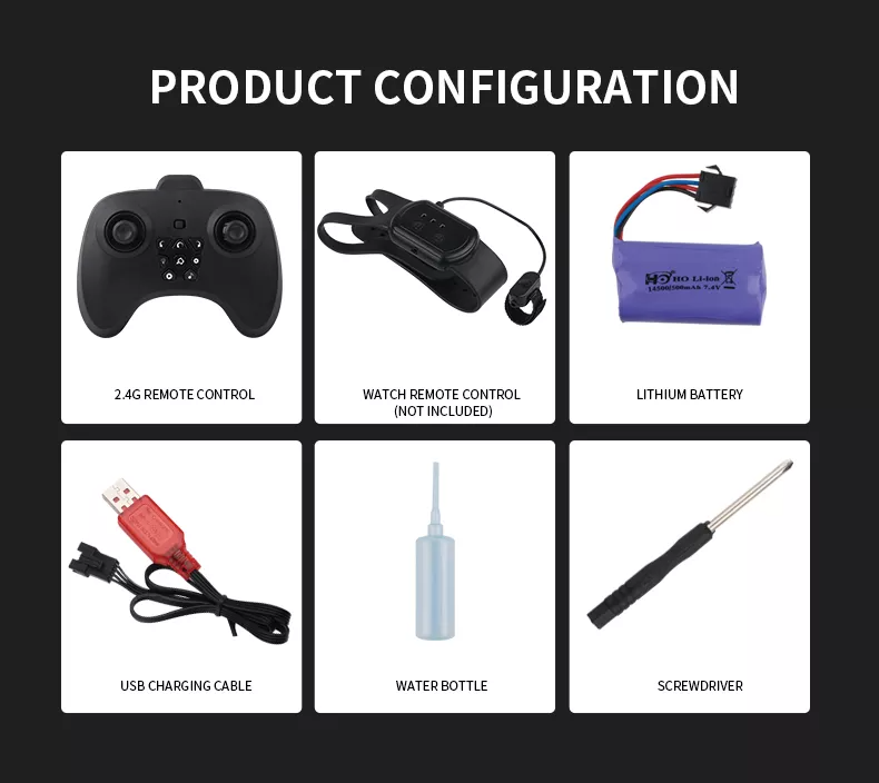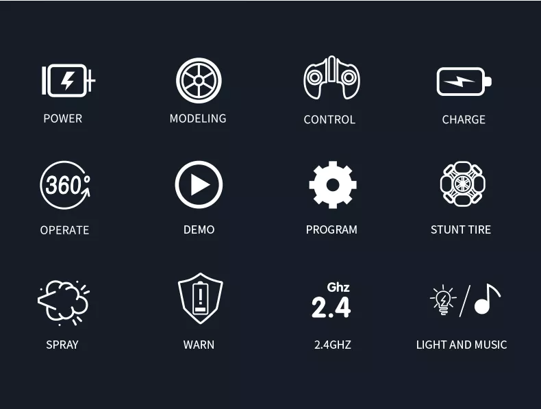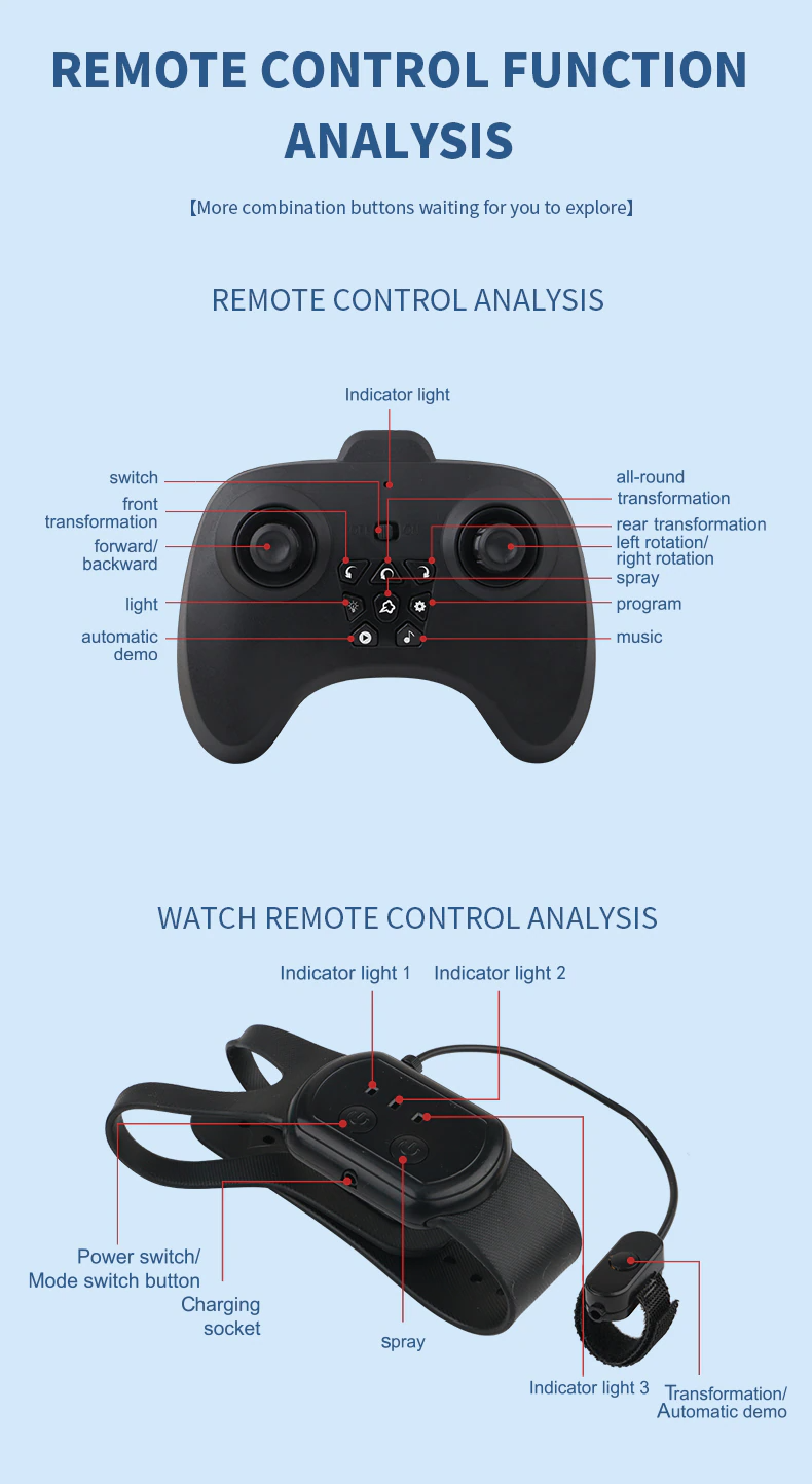 Forward and backward, Left rotation, right rotation, Deformation, Demonstration function, Programming function, With light and music, Low pressure reminder function and Spray function.