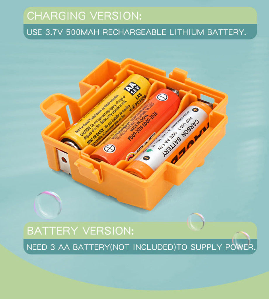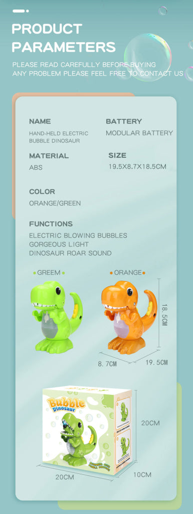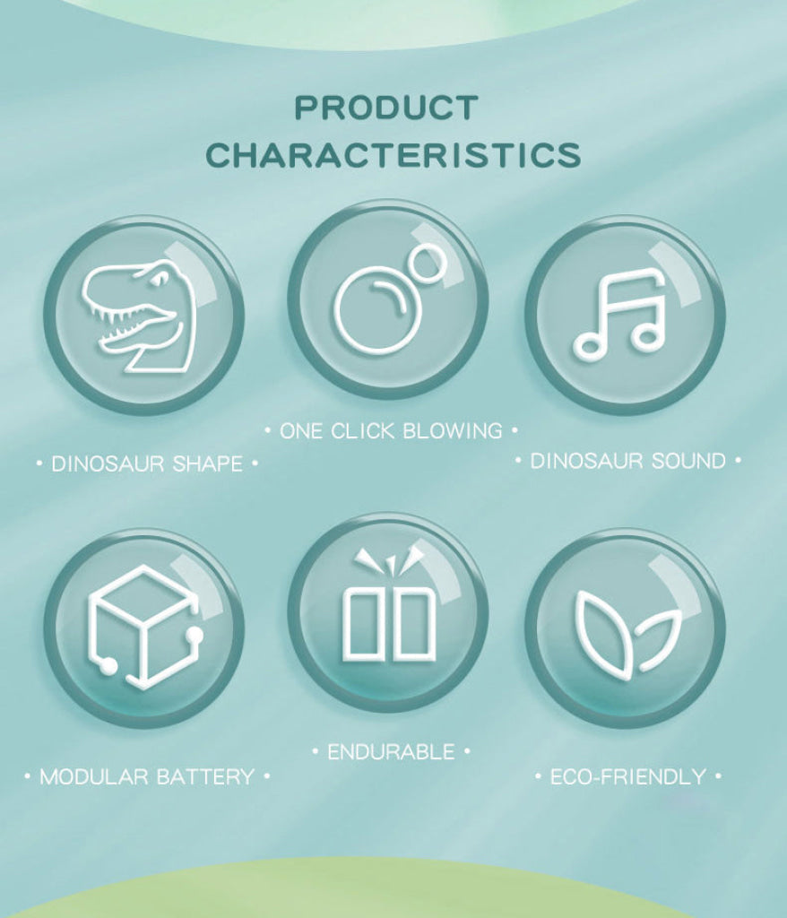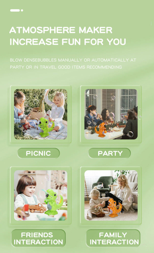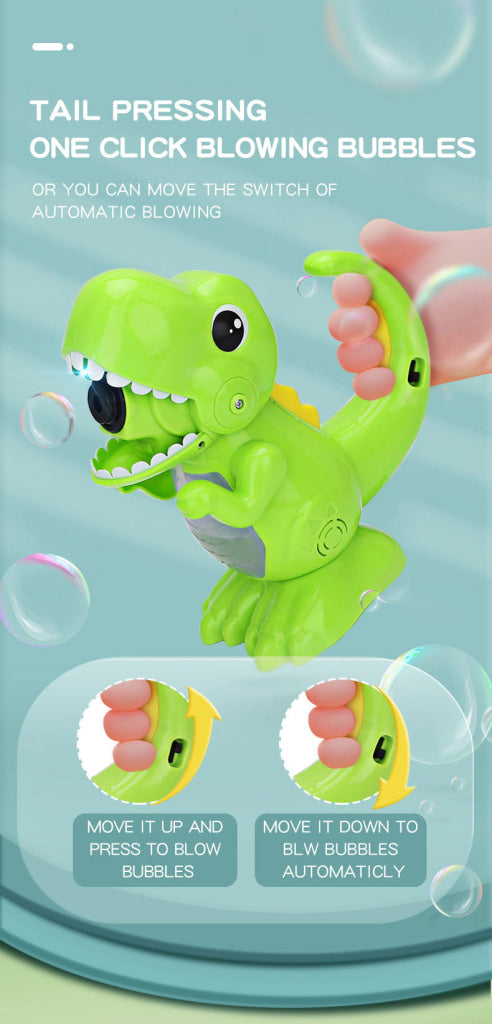 Automatic/Manual mode: Manually press the button on dinosaur tail, and bubbles will be launched from the dinosaur mouth.The bubble machine supports manual mode and continuous bubble blowing mode.