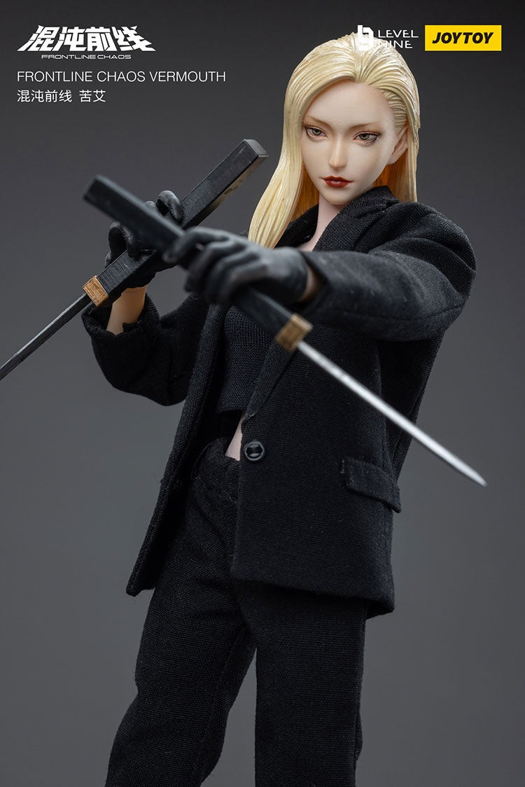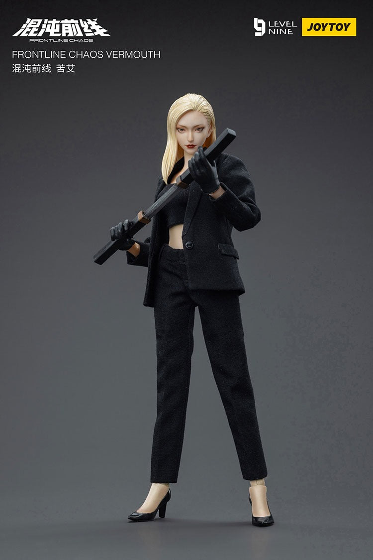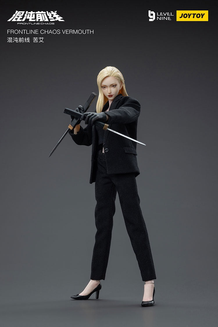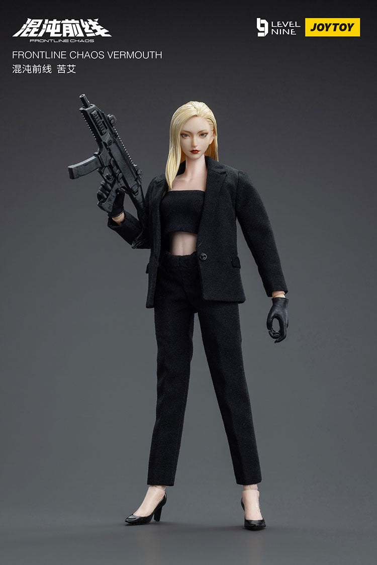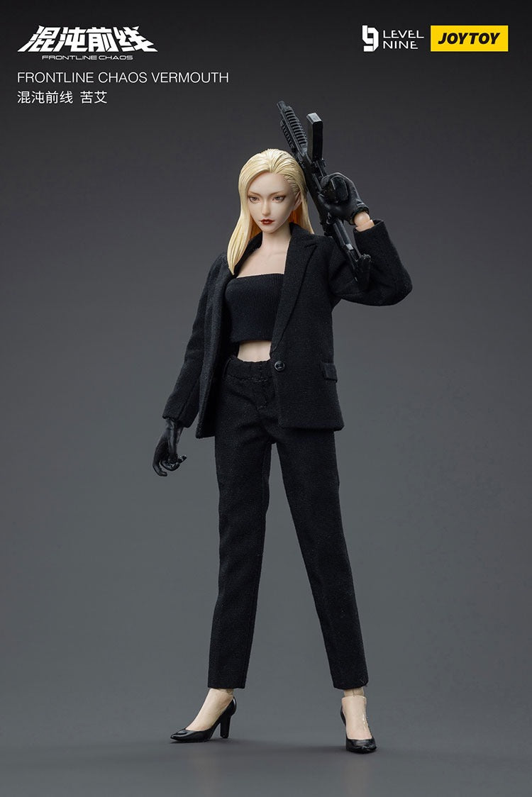From Joy Toy and Level Nine's 1/12 scale figure line Frontline Chaos comes Vermouth, dressed in a classy all-black cloth outfit with interchangeable parts and accessories, including alternate hand parts and different weapons to wield.