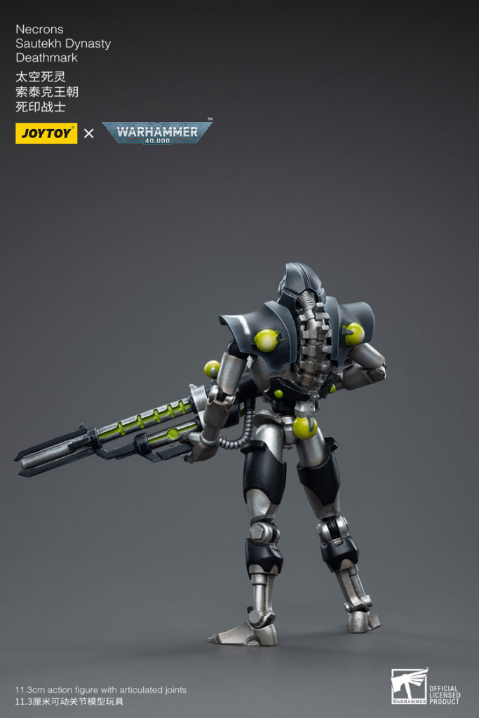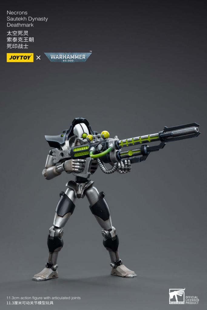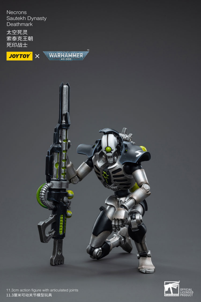 This is a 1/18 scale highly detailed, articulated figure based on Warhammer 40k's Deathmark Necron from the Sautekh Dynasty. The Deathmark Necron figure comes with several interchangeable parts and accessories, opening the door to a plethora of different and unique display opportunities.