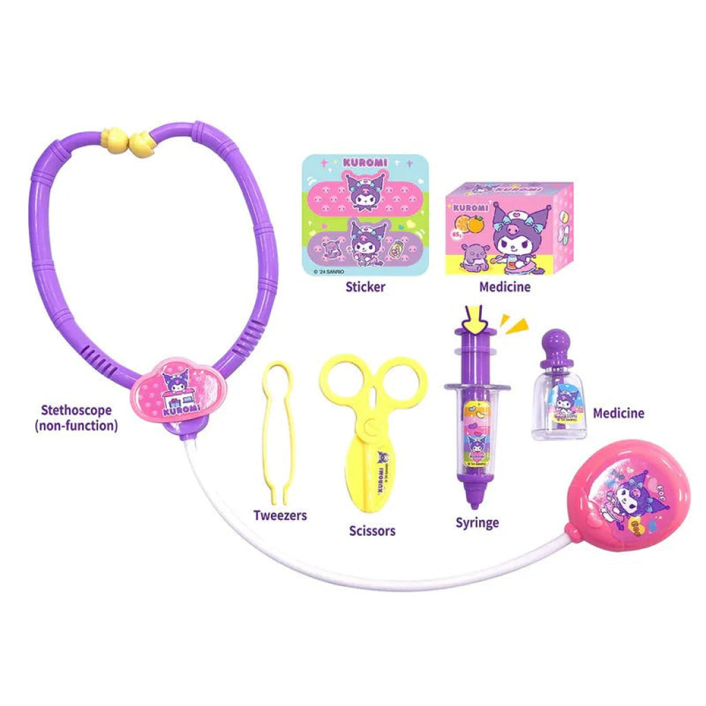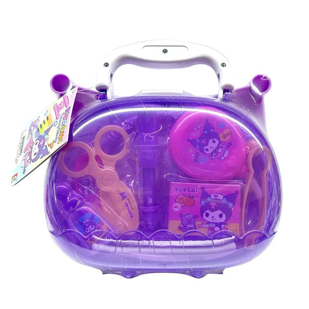 This Kuromi shaped mobile clinic carry case contains a variety of essential medical accessories, such as a stethoscope, syringe, and medications.