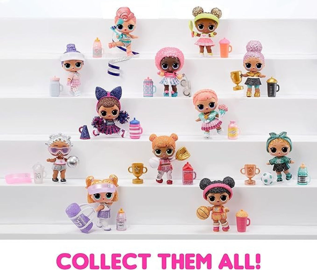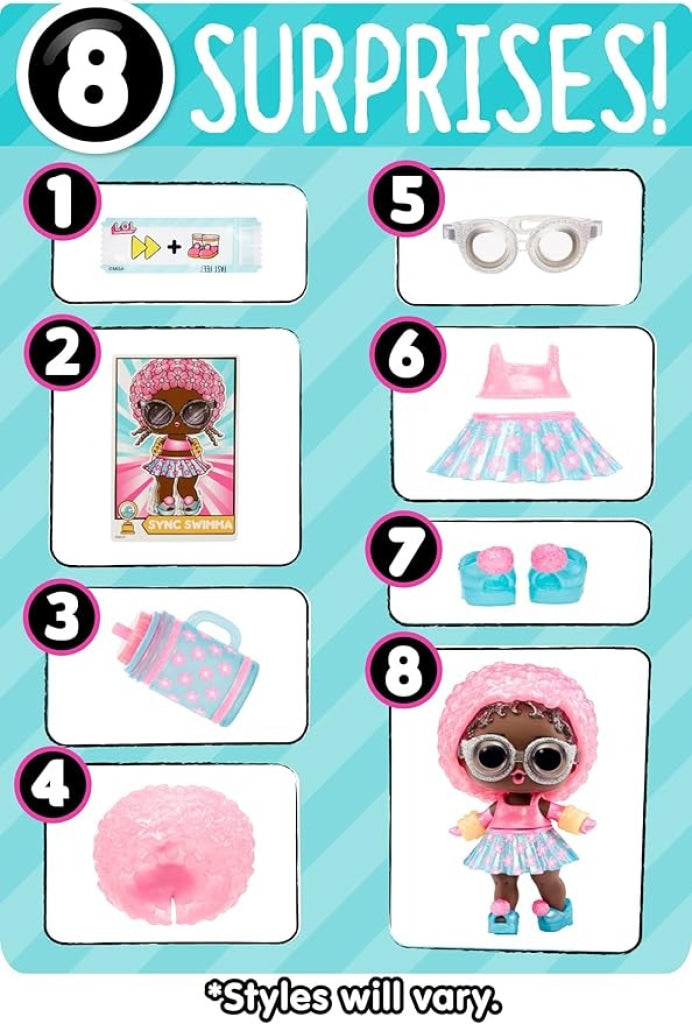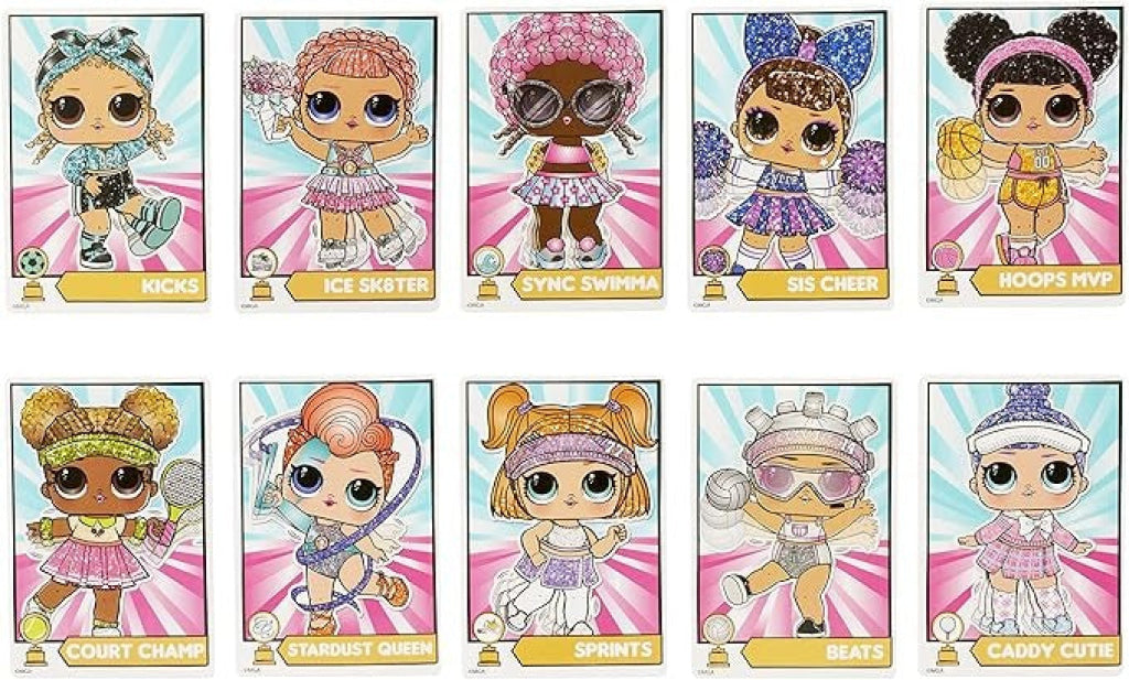 - UNBOX 8 SURPRISES including a collectible doll, a glittery outfit, shoes, sports-themed accessories, a bottle, a trading card, and a secret message.