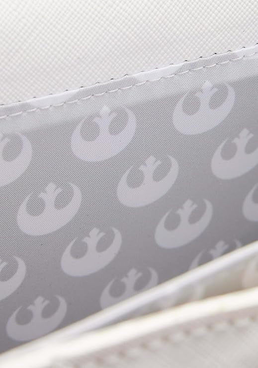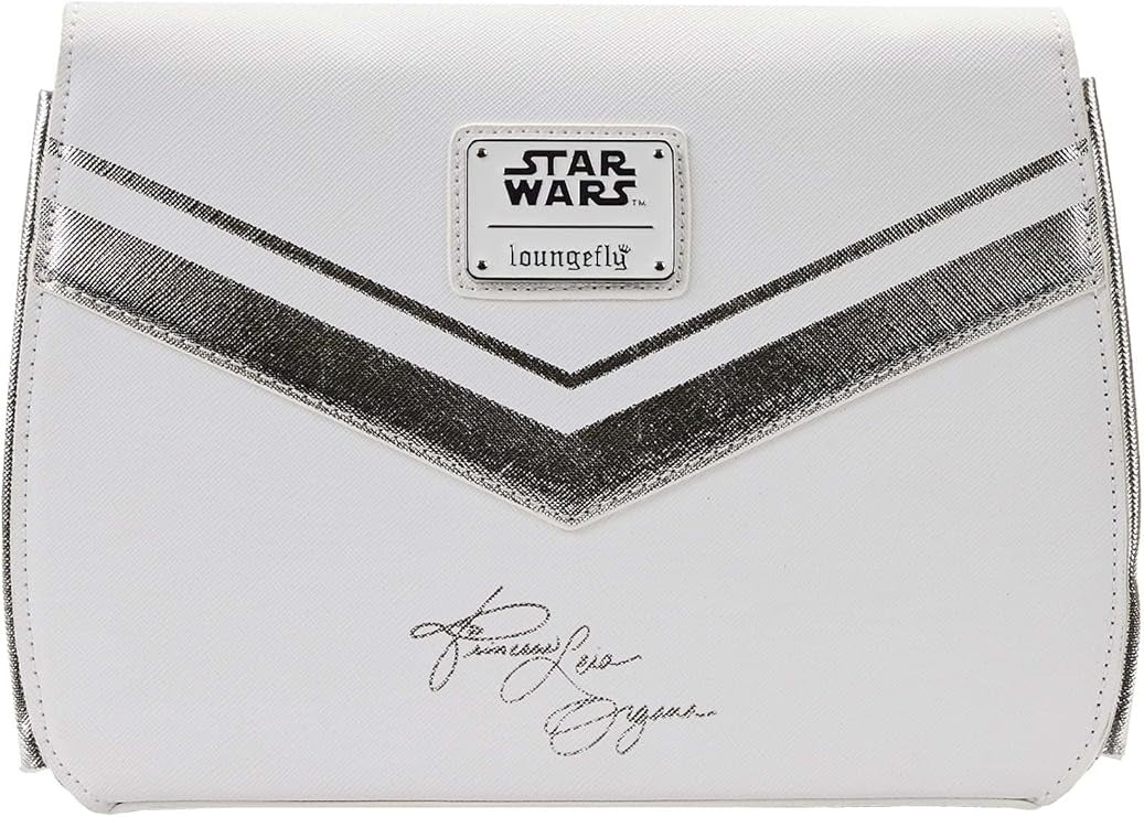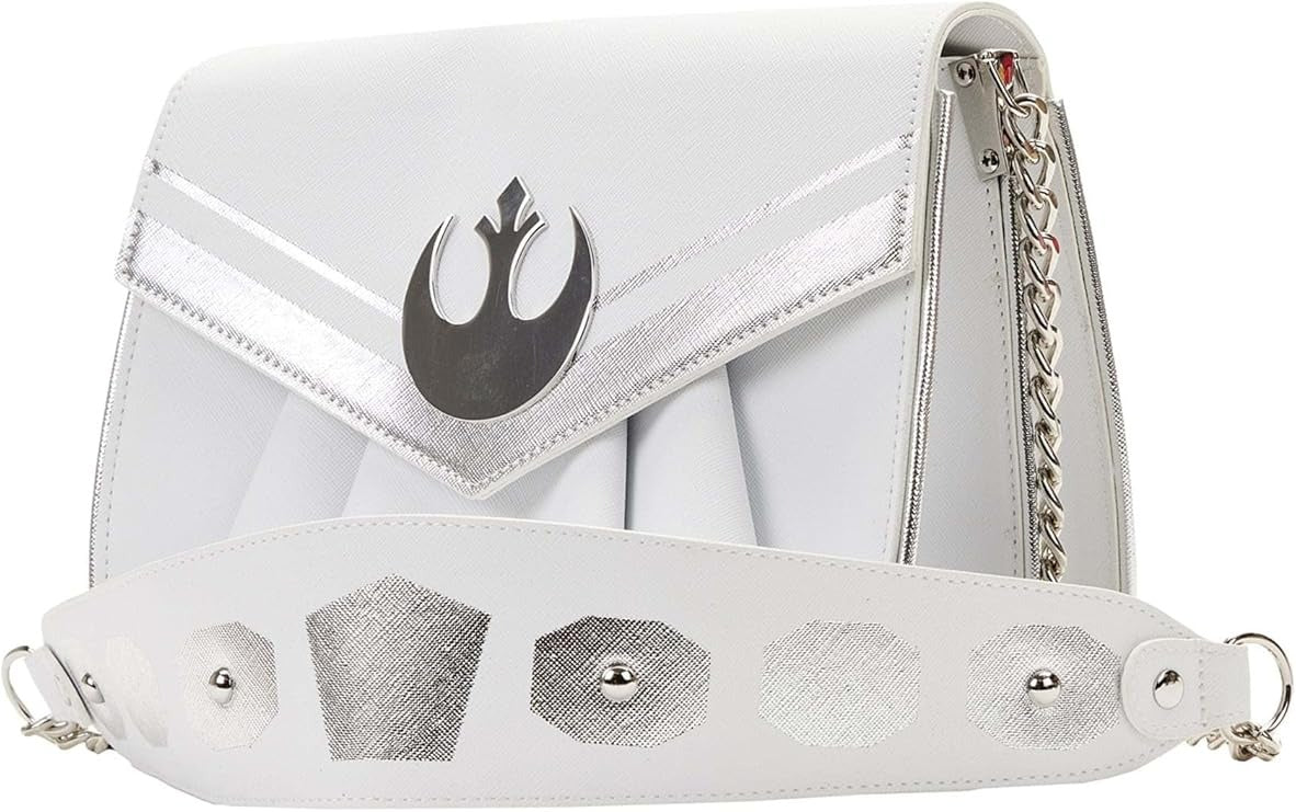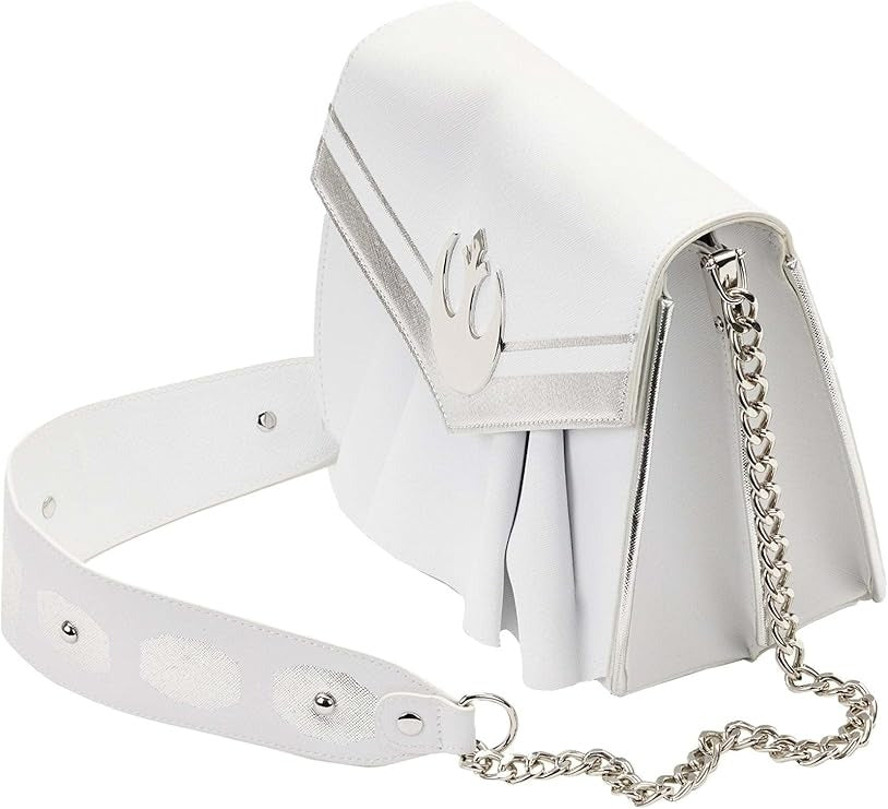 Follow in the footsteps of the one and only Princess Leia with the Loungefly Star Wars Princess Leia White Cosplay Chain Strap Crossbody! This faux leather crossbody is meant to look like Leia's sensational white long gown from Episode IV. You'll find a metal rivet of the Rebel Alliance emblem on the front and ruffles on both sides to give the dress more depth! You'll also find embroidered and printed details along with a large storage compartment, shiny metal hardware and a chain shoulder strap.