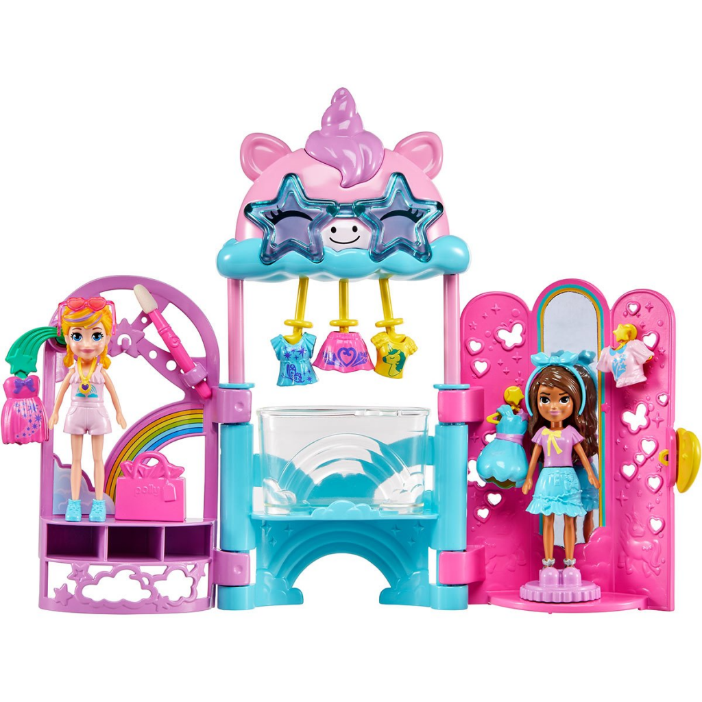Polly Pocket Pollyville Pet Adventure Treehouse PlaysetIncluded are Polly and Shani micro dolls, 4 adorable animal figures, 9 accessories for pet party fun and 1 swan vehicle. The action starts by driving the swan vehicle over the speed bump to expand the playset and trigger a zipline plus driving over a second speed bump expands the waterfall slide. Kids can explore hidden surprises and play spaces on five floors and in areas like the hidden escape slide in the doghouse, treetop lookout, rock climbing area, hot air balloon ride, basket swing, secret storage and more. Colors and decorations may vary. Makes a great gift for ages 4 years old and up.