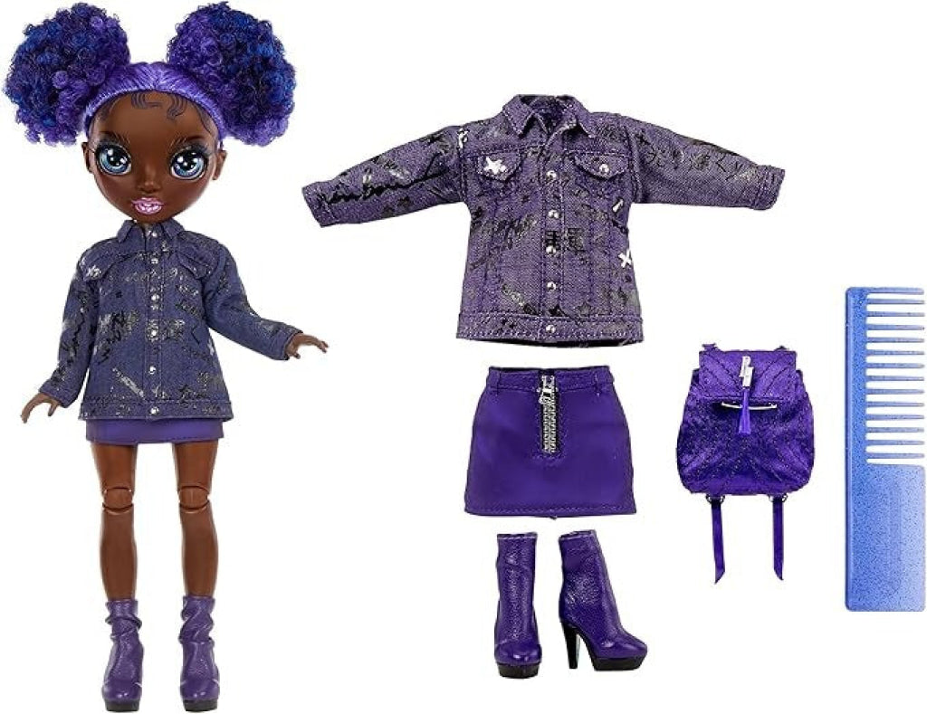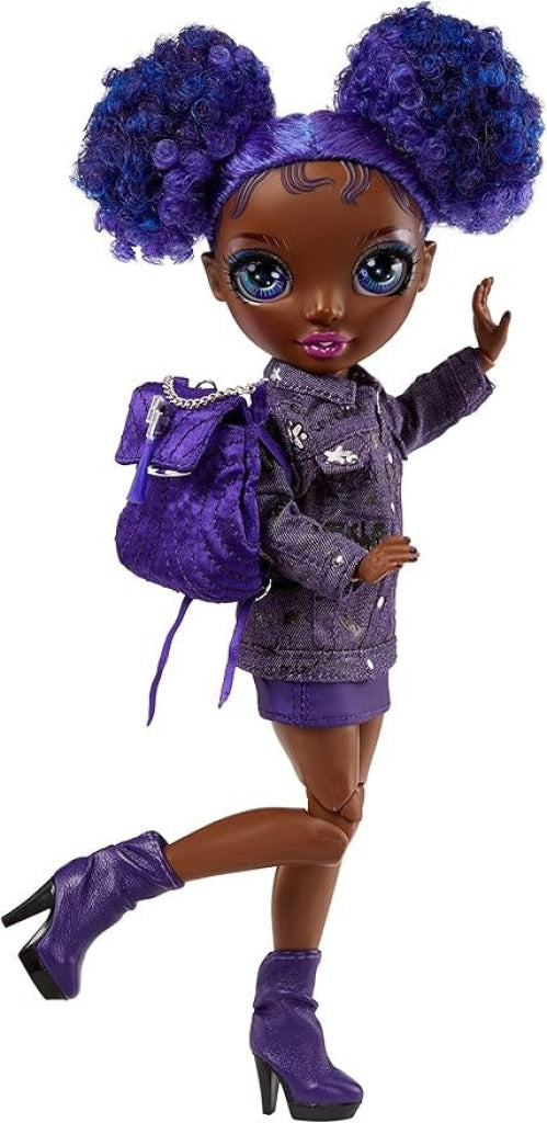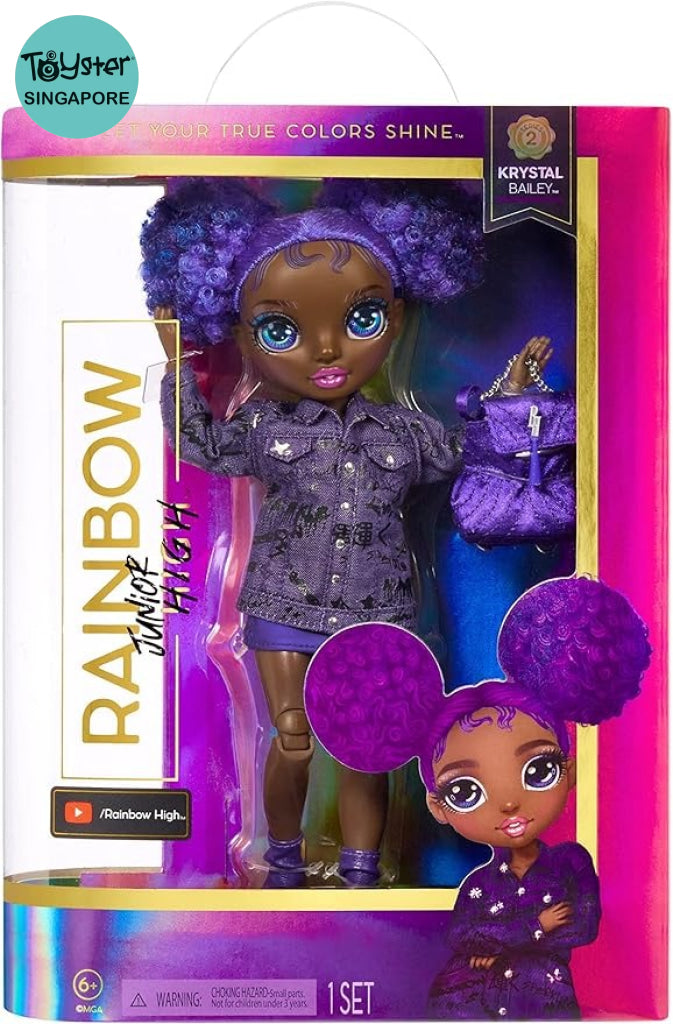 - GORGEOUS FEATURES: Krystal Bailey is dressed in her signature PURPLE from head to toe. She has a gorgeous younger face sculpt, detailed features in her fashion, beautiful curly purple hair in two buns, long eye lashes and glass eyes. Collect the Rainbow of all the gorgeous Jr High fashion dolls.