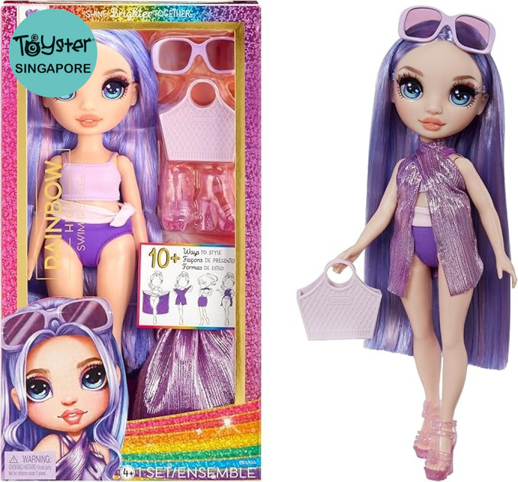 - INSPIRES KIDS TO BE CREATIVE: Our new, Rainbow High Swim & Style Violet Fashion Dolls comes with an adorable wrap that can be styled 10+ways. Collect and play with all these fun and beautiful Swim & Styles dolls together or mix and match them.