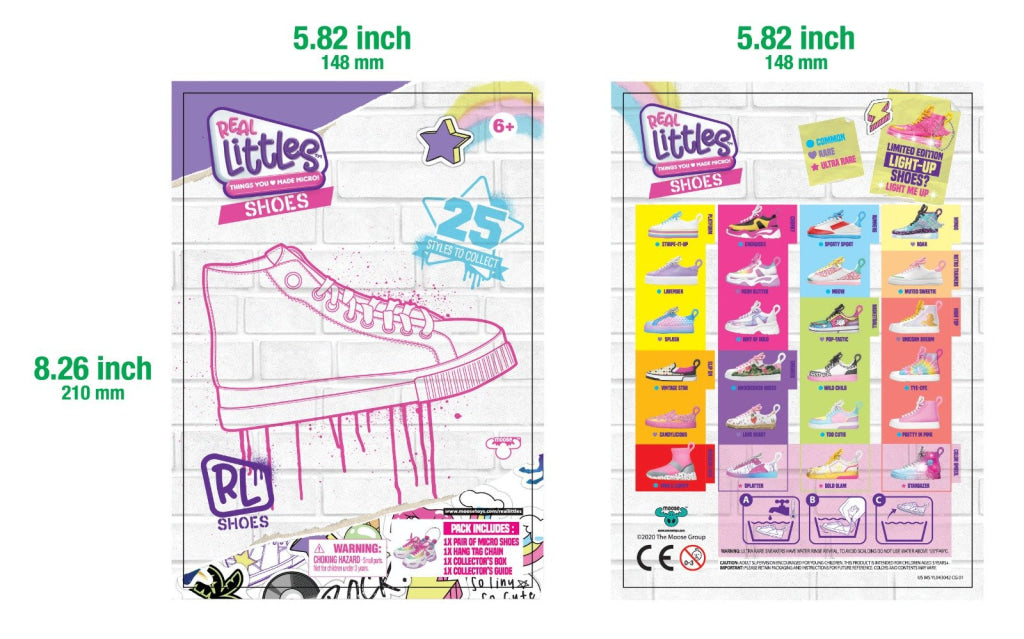 Each pair of Sneakers come in its own cute realistic miniature sneaker Box. Open it up and be surprised by the super cool designs you will find inside. There are Common, Rare and Ultra Rare Sneakers to collect including Ultra Rare Colour Change Sneakers!Dip them in cold water and be amazed as they change before your eyes during their 'Water Rinse Reveal'! Or Maybe you will unbox the Limited Edition Light-Up Sneakers! Watch their soles sparkle as they actually light up! Each pair of Real Littles toy Sneakers comes with a Hang Tag Chain so kids can hang them anywhere they want.