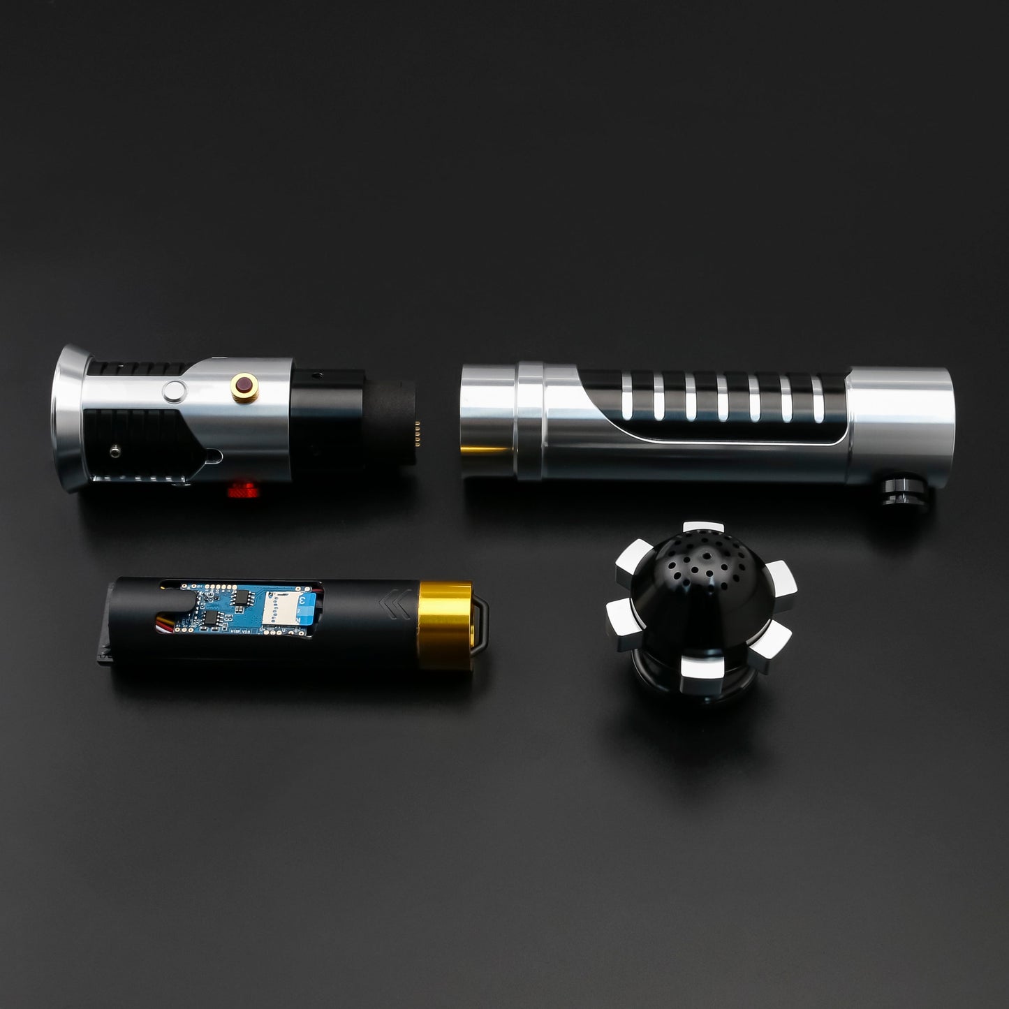 The hilt design of the SV-Obi lightsaber pays great attention to details. The SV-OBI combines traditional Jedi aesthetics with a cylindrical silver hilt that makes the hilt surface look smooth and polished. Black is used as the embellishment color of the grip part. This strong color combination enhances the user's grip. The hilt design of SV-OBI is in line with the combination of practicality and elegance of the Jedi Knight. The classic combination of silver and black perfectly blends with Jedi aesthetics.