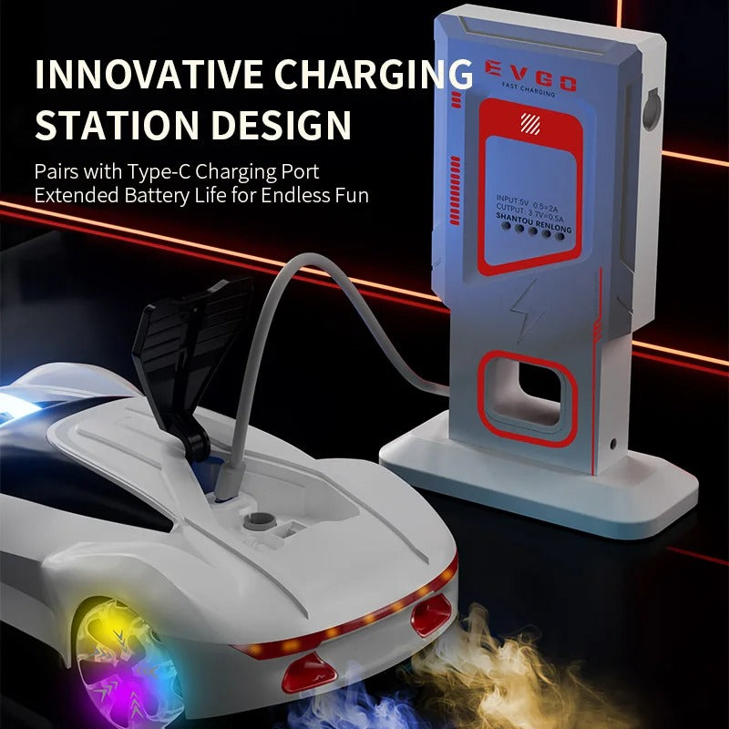 Cool lighting, paired with dynamic sound effects. Multi-directional driving capable of high-speed drifts and sharp tail slides. Spray system simulates real exhaust smoke effects for an immersive driving experience. Innovative simulated charging station design, with Type-C charging port.