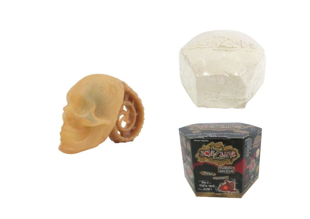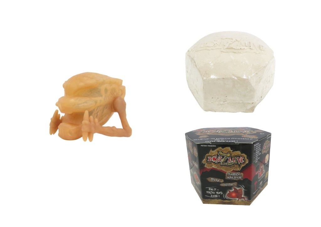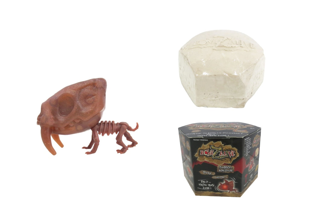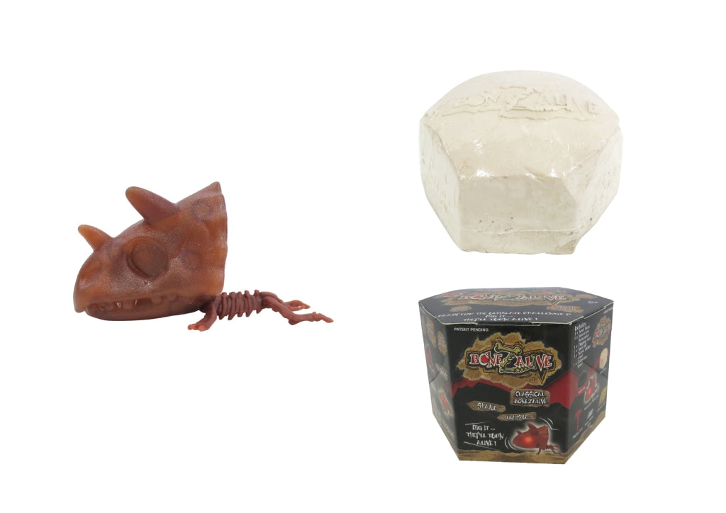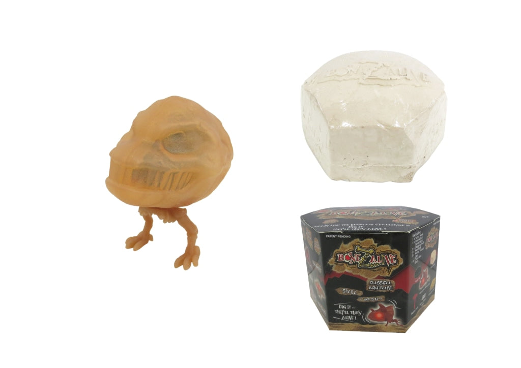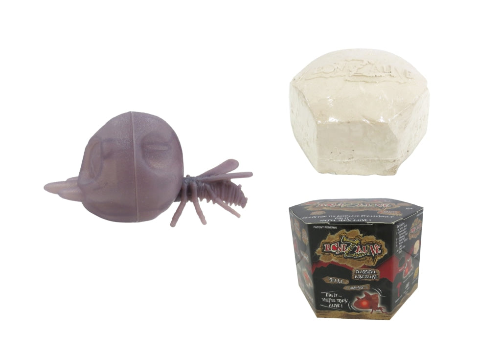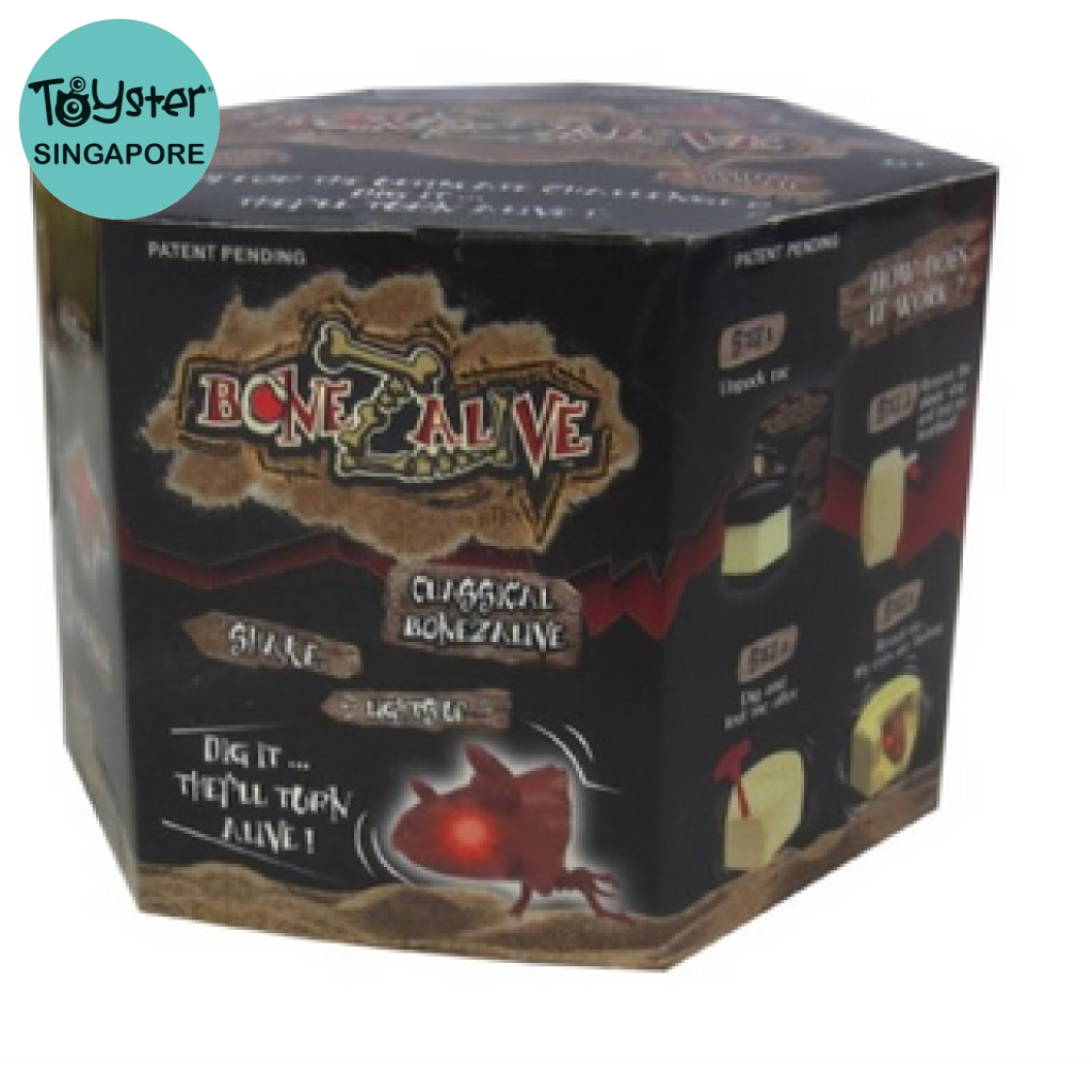 Bonezalive are new collectible interactive digging kits. Once you start digging with the provided tool, the sand block starts to vibrate. Then what you will discover are dinosaur creatures with flashing red eyes! Reuse the sand and transform it into a sand pit for your dinosaur. Collect them all! Includes sand block, 1 interactive Bonezalive, digging tool, blister tray, name sticker, and collection sheet.