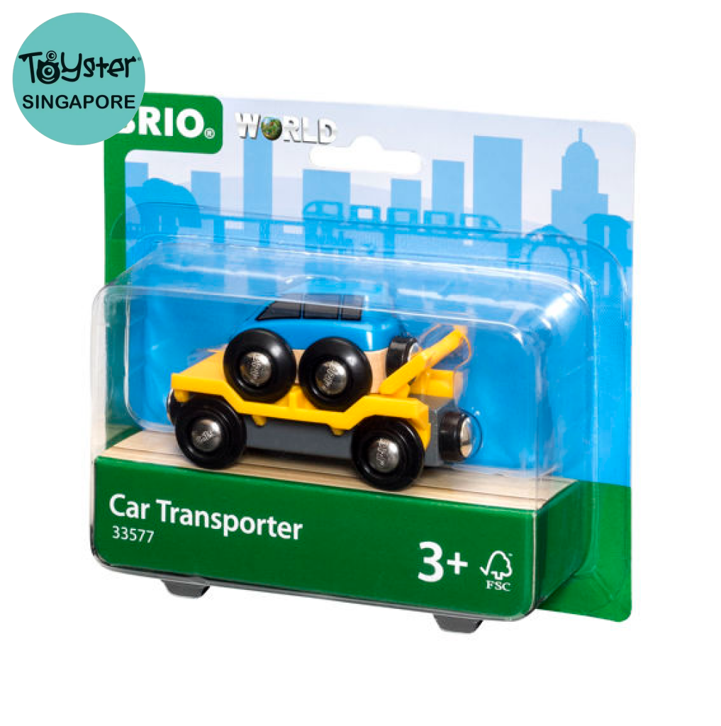 Add this car transporter to your Railway world complete with a brand new BRIO car. Let the car drive on and off the transporter by tilting the wagon ramp. Attach two or more transporter wagons for added fun – the cars can then drive from one wagon to another.