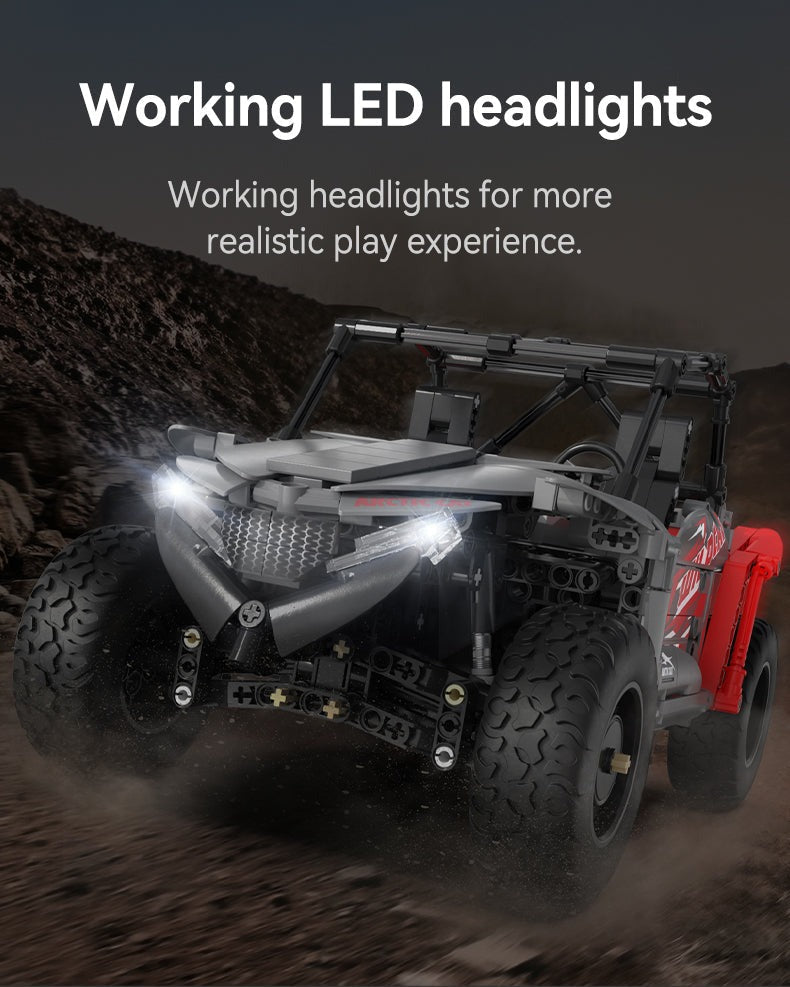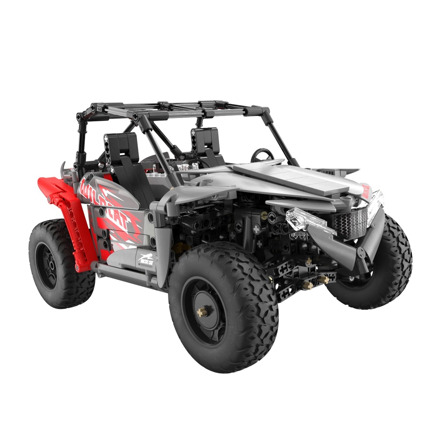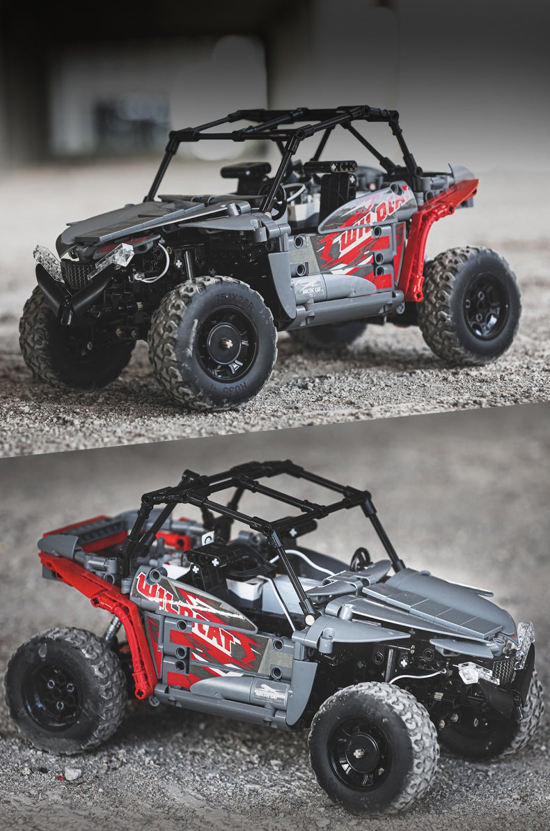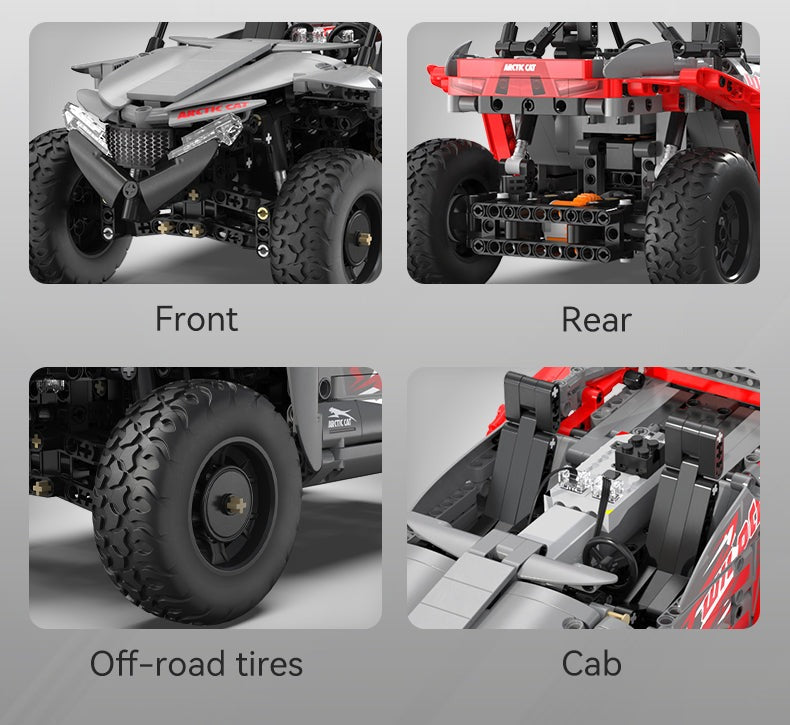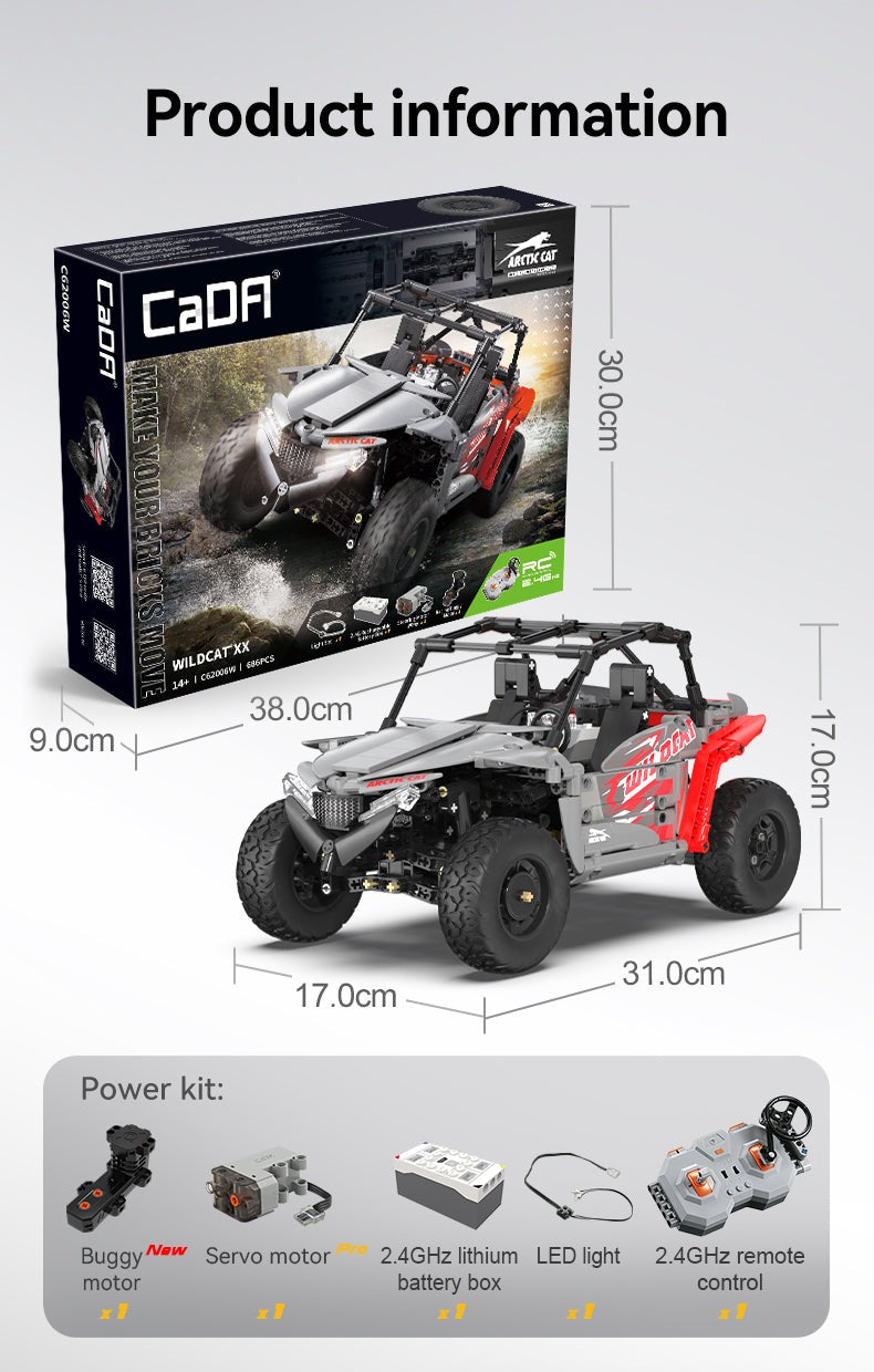 Embark on thrilling CaDA Arctic Cat adventures. Introducing the meticulously crafted replica of the Wildcat XX - now available in an elegant combination of timeless grey and striking red. Once you've assembled the model, unleash its full potential with the high-performance CaDA power pack, complete with a supercharged buggy motor. The model is equipped with front and back suspension, high grip tires, opening doors, and working front lights, this buggy is designed to take your remote control adventures to the next level just like regular RC toy truck. The RC buggy set C62006W includes a power pack complete with a remote control, battery, servo motor pro, buggy motor, and LED lights.