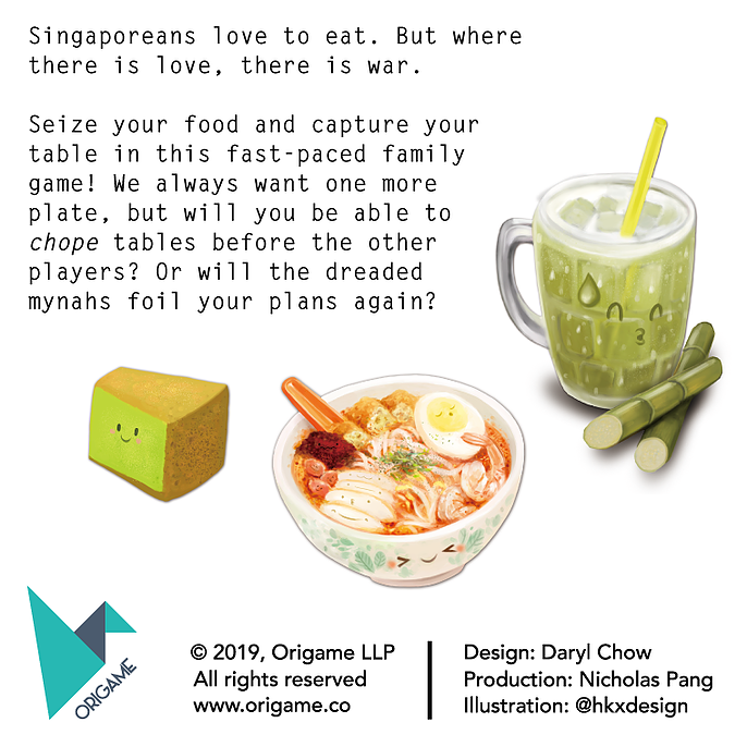 Seize your food and capture your table in this fast-paced family game! We always want one more plate, but will you be able to chope tables before the other players? Or will the dreaded mynahs foil your plans again?