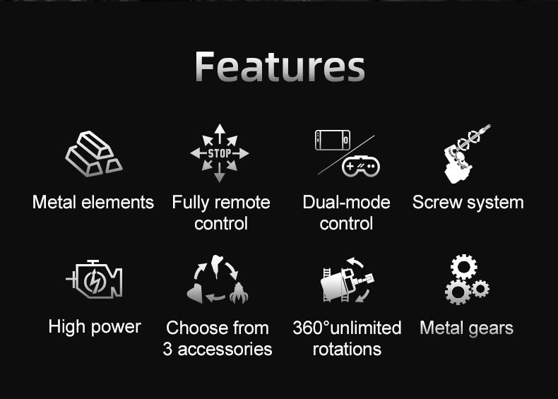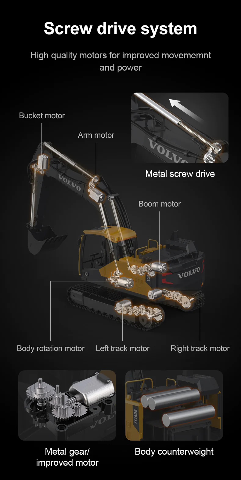 The new version of RC Volvo excavators is built with many metal elements, including boom/bucket metal screw drive system. This digger also features counterweight plates installed at the back for great balance - all powered by two powerful motors. The excavator smart construction allows for more remote control fun with the addition of interchangeable tools: grappler and hummer.