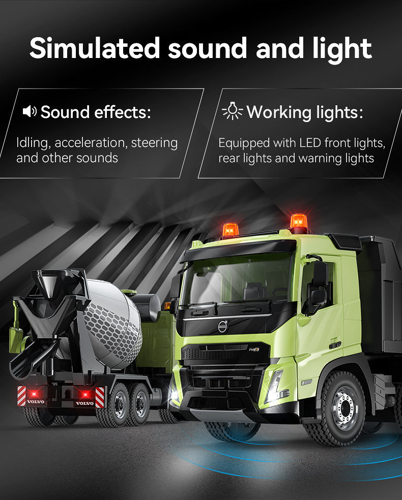 - Concrete Mixer -- Authentic designs with approximately 1:20 ratio to actual vehicles: 8 Channel full function, mixer rotate and discharge by remote. with LED lights and working sounds. This engineering construction toy not only helps kids to gain more knowledge about vehicles but allows them to potentially become interested in the professions associated with them.