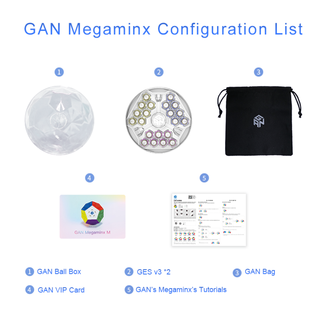 Package comes with a GAN ball display box, 2 boxes of GES, black GAN pouch, GAN VIP Card and instruction manual.