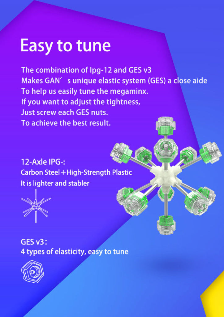 - INNER STRUCTURE MATTERS - To keep it light and stable, GAN Megaminx features 12-axis IPG core inside, made from carbon steel and high-strength plastic. It's also tunable with interchangeable GES nuts.
