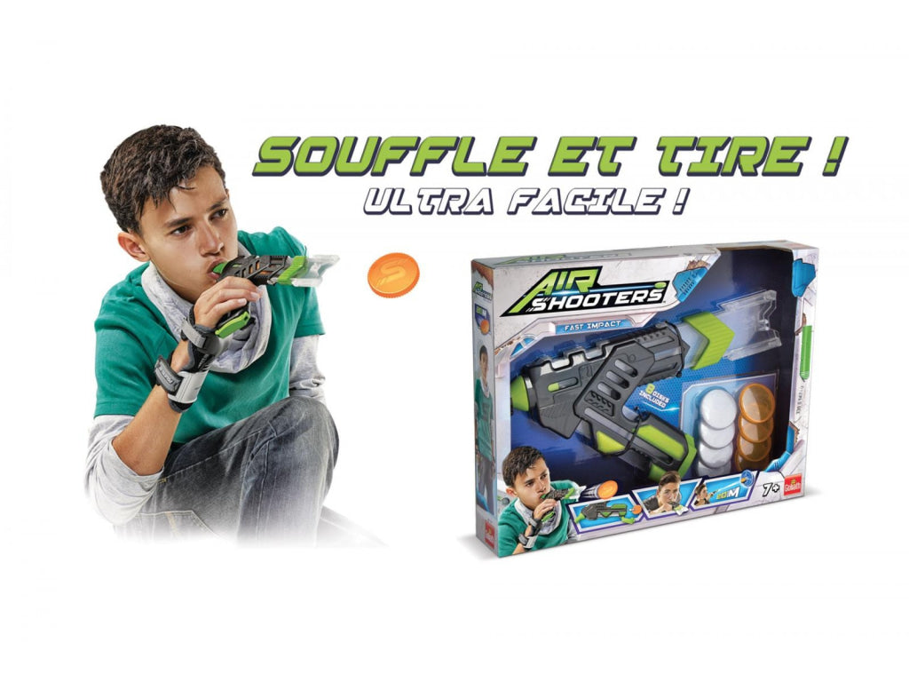 A new generation of blow disks that shoot through the air for up to 20 metres! Hold the blaster horizontally and the harder you blow, the further the disks will go! Suitable for both indoor and outdoor play.
