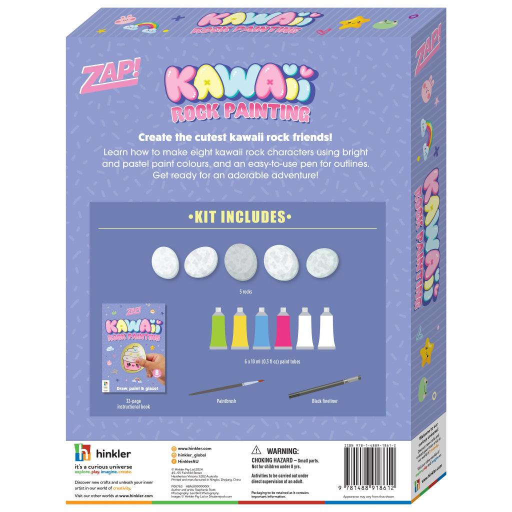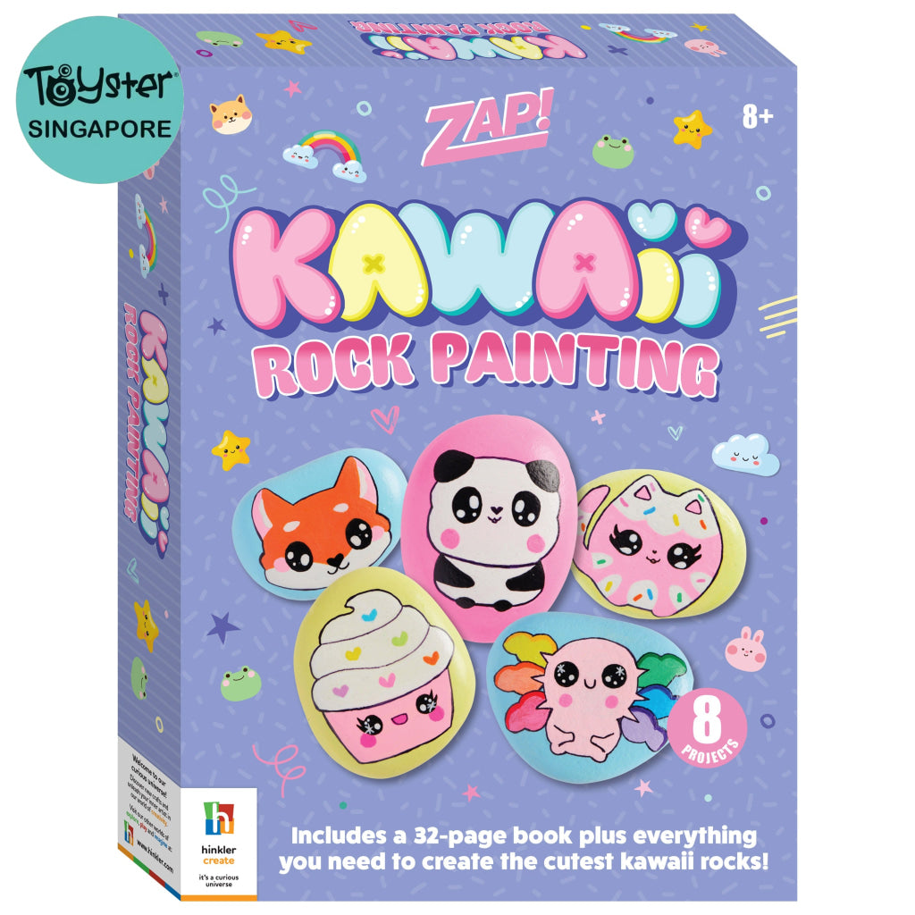 Filled with the coolest components, this kit contains everything you need to create your very own Kawaii rocks! Use the bright paints provided and follow the easy step-by-step instructions in the 32-page book to create 5 whole awesome and adorable Kawaii rock creatures!