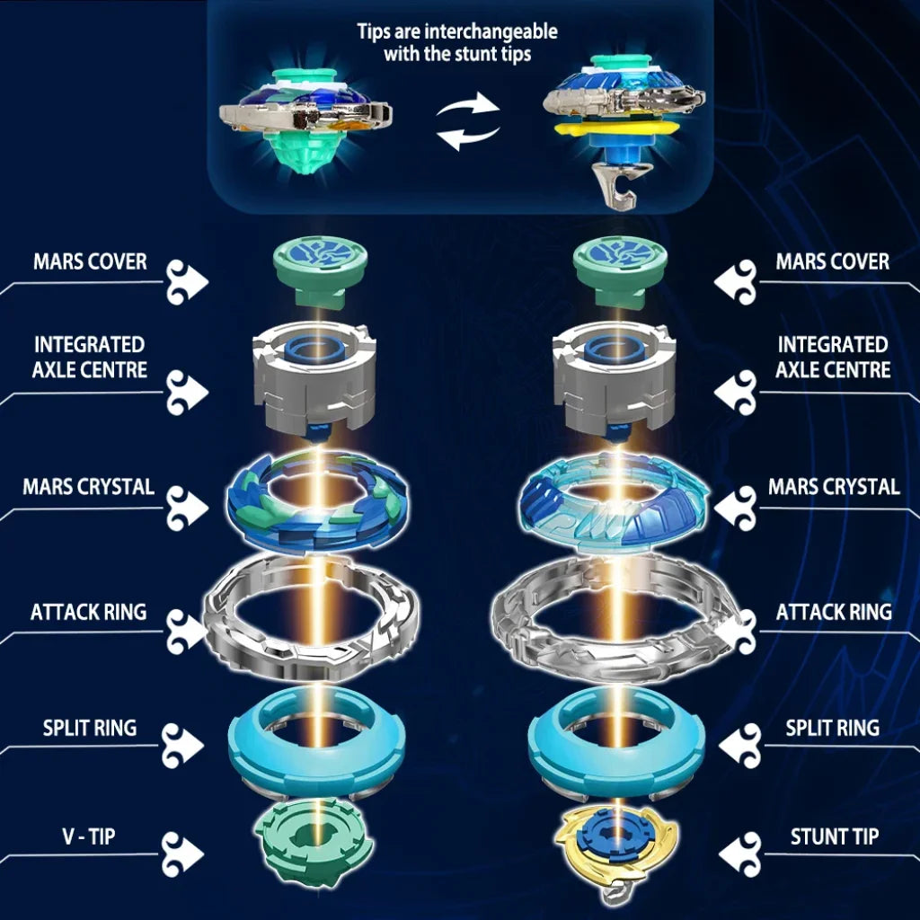 The Infinity Nado Set consists of 6 main parts: the radar cap, the integrated central axis, the Mars crystal, the attack ring, the separation ring and the v-tip. All these elements are interchangeable with the other Metal, Standard and Athletic series nado.