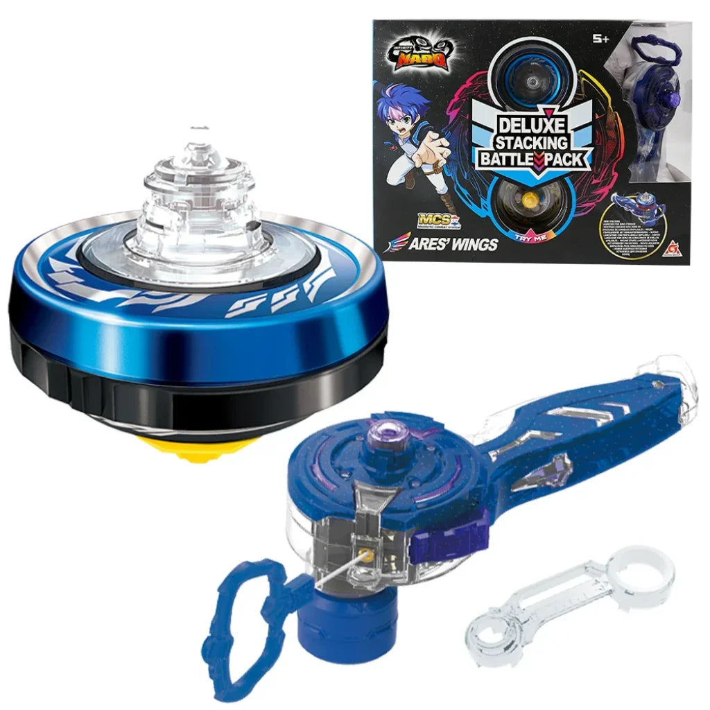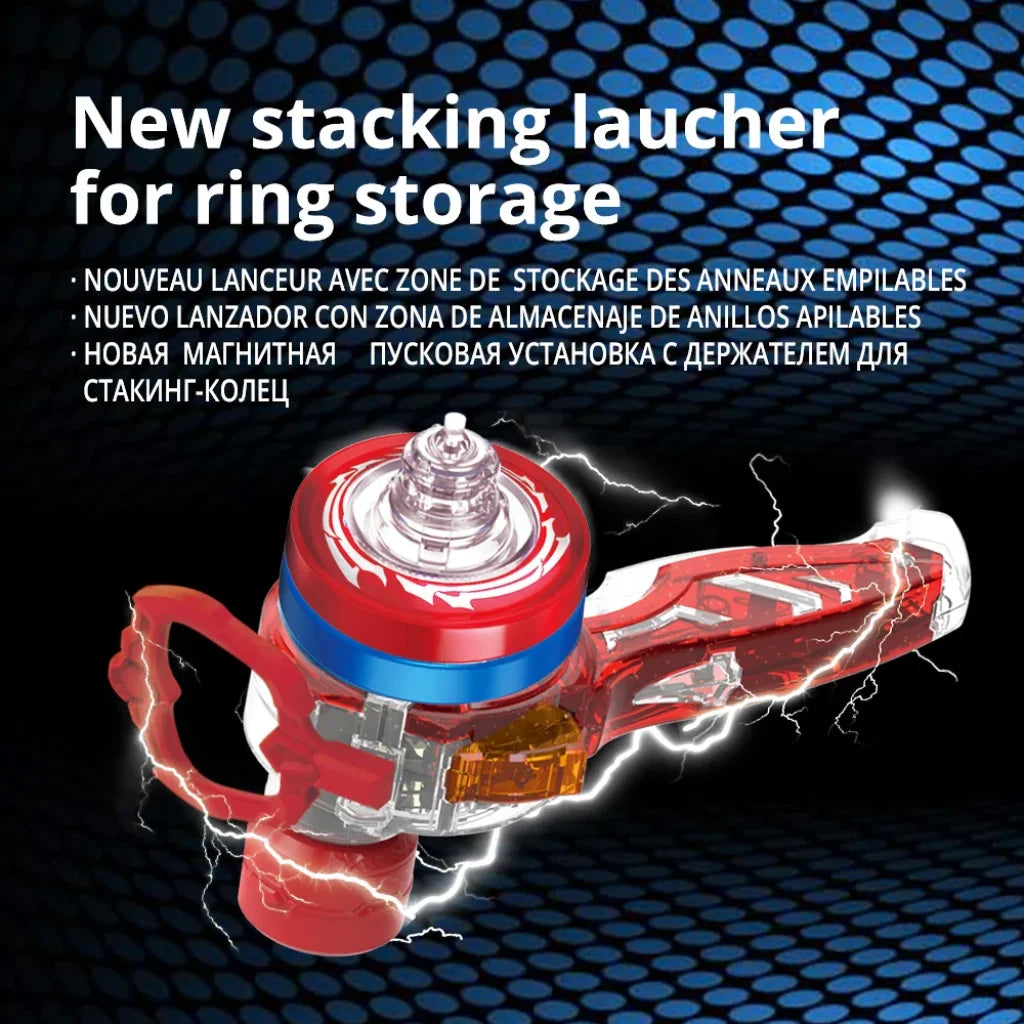 Launch Stacking Rings on the Stacking spinning top, activate the light mode for extra power - have a colourful Blade Battle! Use the Staking Deluxe series spinning top,with the rings from the 3-in-1 set and with other Staking series sets to create the tallest and most epic Infinity Nado spinning top,. The new magnetic ring launcher with ring holder allows you to collect staking rings and launch them onto the staking spinning top,as quickly as possible during the battle.