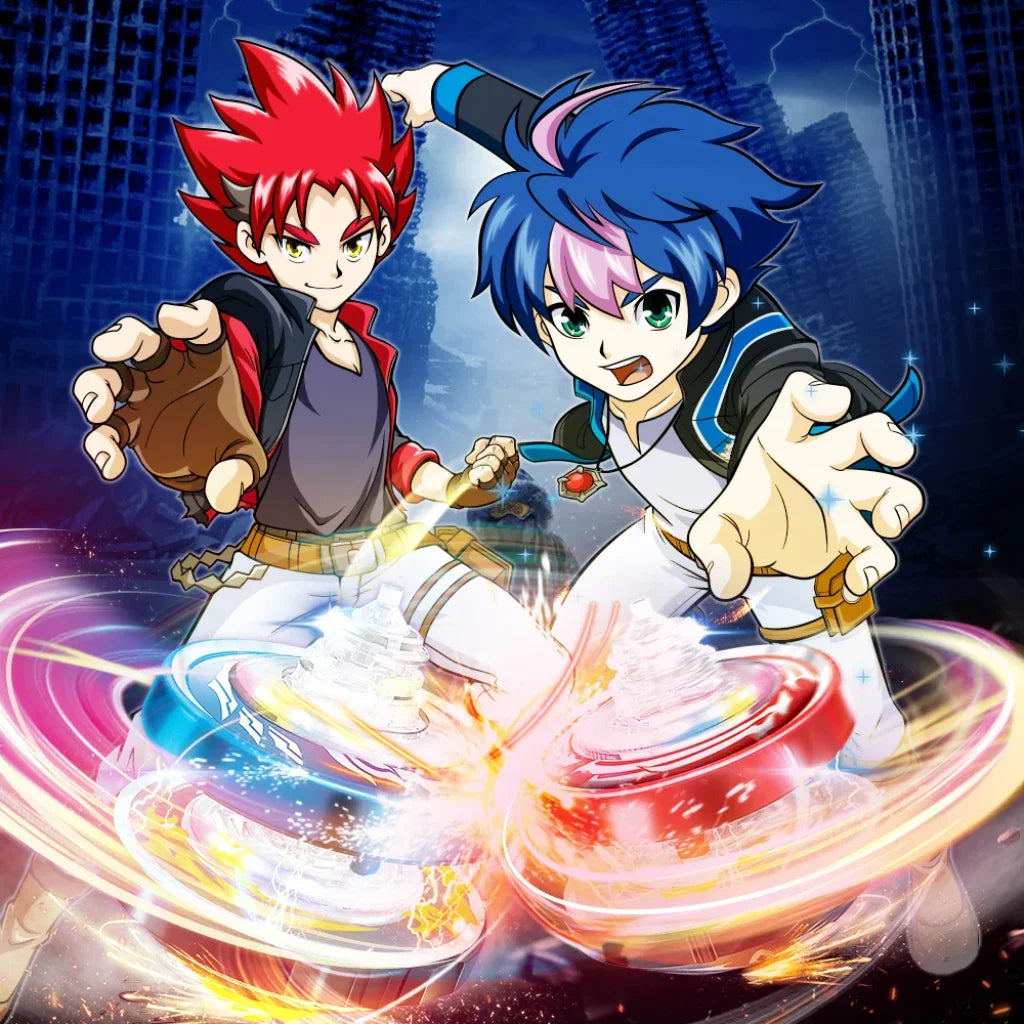 Launch the basic Nado with your opponents at the same time. Find a good timing to stack the spinning top on your basic Nado to speed it up. Choose your best strategy, activate the aggressive mode and win the game.