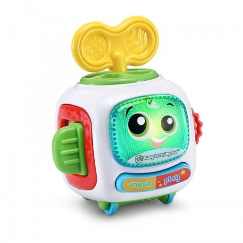 Meet the motor-sensory toy that's bursting with personality, the Busy Learning Bot™! Explore four sides of fun with spinning gears, buttons, a dial and a slider that deliver learning alongside play. Play mode and Music mode offer two ways to play and learn. Combinations of pressing, twisting and moving the manipulatives prompt the bot to sing the ABC Song, talk about colors and opposites, count from one to five, and much more. Drop some beats, sing the scale and enjoy lots of DJ sound effects in Music mode. Interact with the bot and learn as you play in Play mode. The cute little bot engages the social side of young minds with opportunities to nurture the robot, asking for actions like scratching an itch by turning a dial. Kids will love exploring, learning, singing and laughing with this lovable, sensory robot!