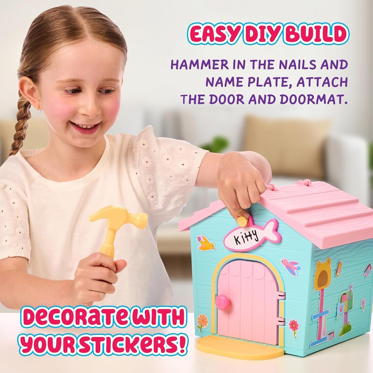 - Build and Decorate Fun: Kids can build their mini cat toy house using included parts like a door, doormat, nameplate, and hammer; personalize your animal house toy with cute stickers and make it official with the included pet adoption certificate