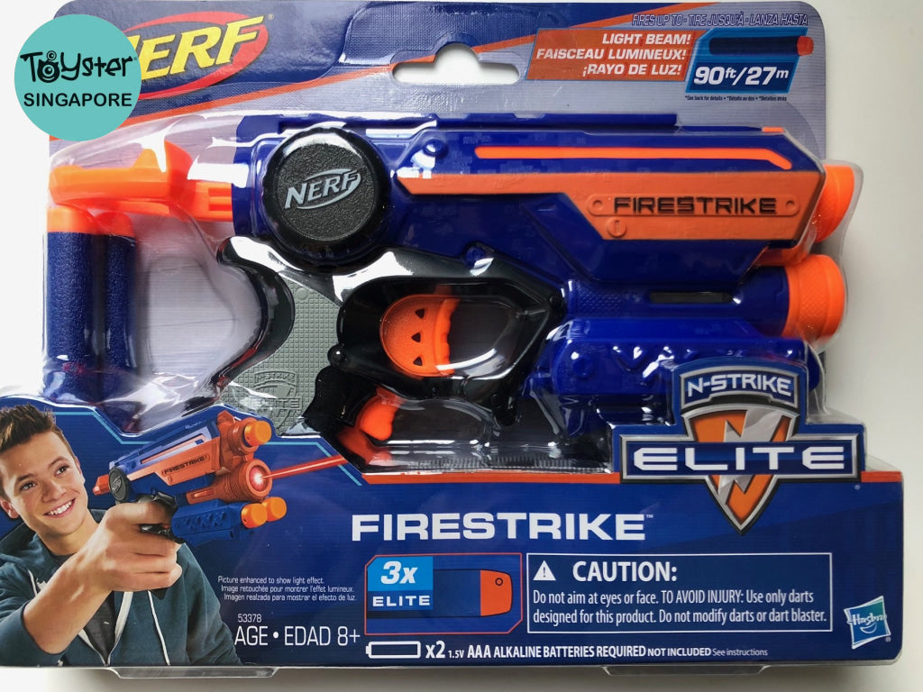 Complete your mission even in the shadows with the FIRESTRIKE blaster! This compact blaster's precision light beam targeting gives you laser-like focus even in low-light conditions! Activate the Light Beam Trigger to zero in on targets up to 15 feet away. The FIRESTRIKE blaster launches Elite Darts up to 90 feet! As with most N-STRIKE blasters, the Tactical Rail lets you add most N-STRIKE Tactical Rail accessories (sold separately) for more battle capability. Power up the Light Beam on your FIRESTRIKE blaster and hit your target with one shot! FIRESTRIKE blaster comes with Light Beam targeting! Precision Light Beam works on targets up to 15 feet away! Tactical Rail is compatible with most N-STRIKE accessories! (Each sold separately.)