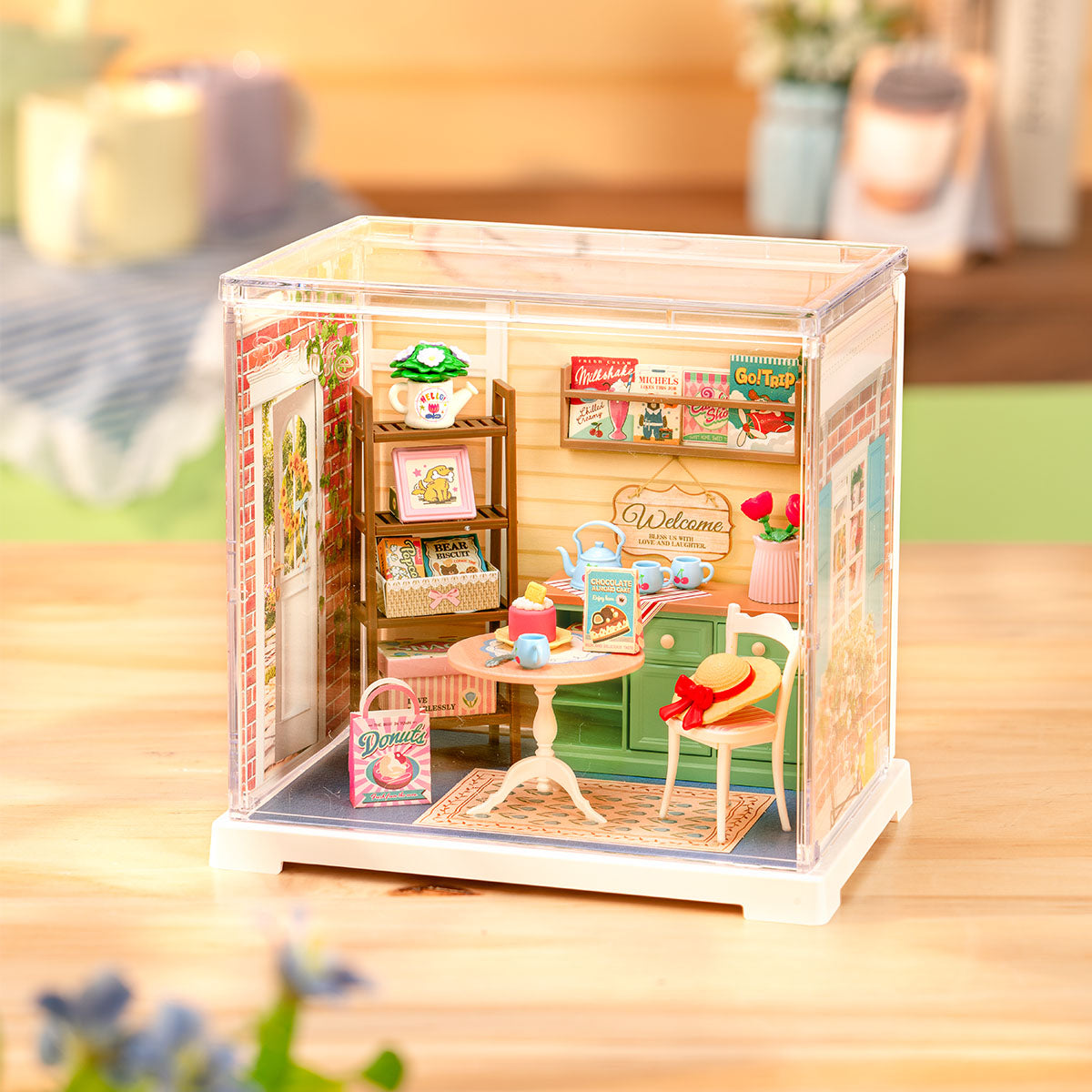 t's a wonderful sunny afternoon at the Rolife Sunshine Sip Porch, a DIY miniature house from the Mini Super Creator Series. A flavorful cup of tea sits in delicate blue china, paired with a personal-sized cake on a dainty round table. More treats await in the rattan-style basket on the third shelf, while a paper bag of donuts rests on the floor for anyone with a sweet tooth. Set your hat on the spare seat and bask in the sunshine as you admire the cozy details such as the storybooks, framed picture, and the blooming flowers sitting on the shelves and cabinet. Life in the countryside has never felt so peaceful and inviting. Start your Mini Super Creator collection and bring this heartwarming scene home today.