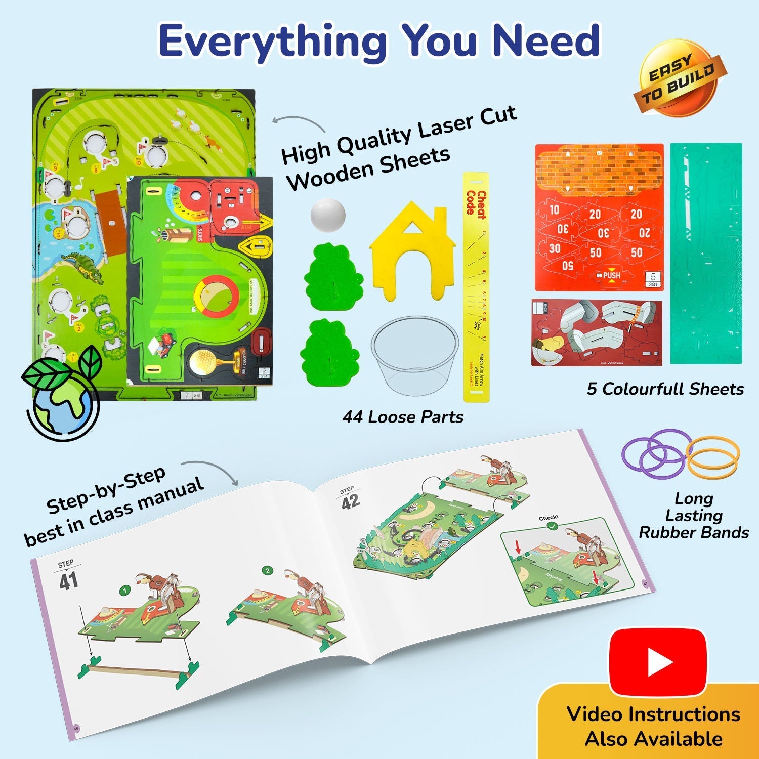 With this kit, your child will build a tabletop Mini Golf game. Aim and shoot the balls using a unique mechanical golf club. Putt the balls into the holes to collect Flag points. Hit the 'Tree Poppers' to make them fly. A cheat sheet is provided for beginners and a golf trophy for champions. The kit comes with easy-to-follow instructions and explanations of STEM concepts.