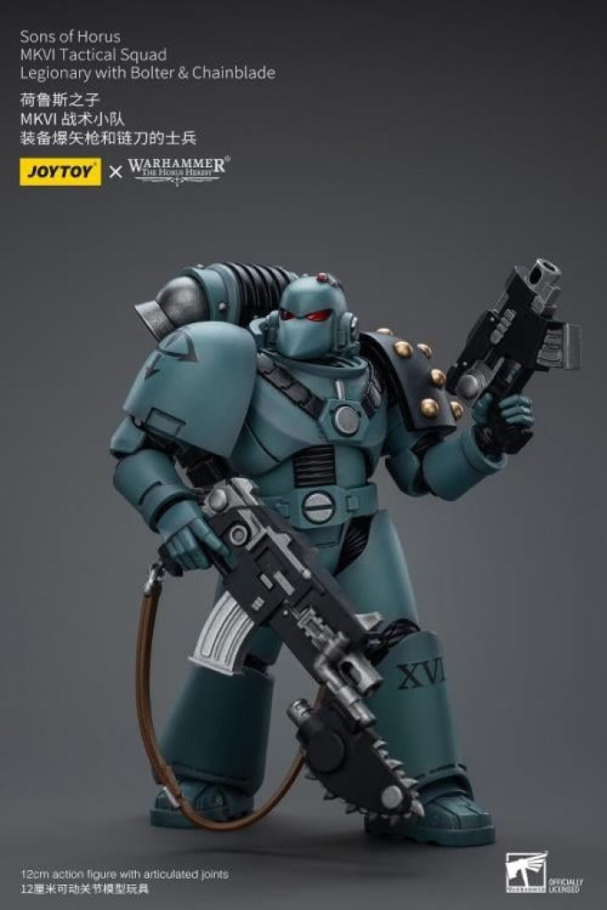 Unleash the JoyToy Warhammer Sons of Horus MKVI Tactical Squad Legionary with Bolter & Chainblade action figure’s incredible power! The Space Marine Legions’ core unit, tactical squads are the means by which the Great Crusade retook most of the galaxy. Legion Tactical squads, equipped with even more impressive weaponry and led by seasoned Tactical sergeants, were at the forefront of nearly every significant battle during the Horus Heresy. The squads were composed of Legionaries with devastating bolters.