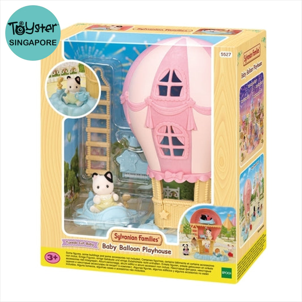 The Baby Balloon Playhouse is a playroom for baby figures in the shape of a balloon. This playroom has a star piano and an airplane bed for taking naps. There is a cloud pool outside of the playroom. Includes Tuxedo Cat Baby. This set includes a figure and furniture and can be played with on its own.