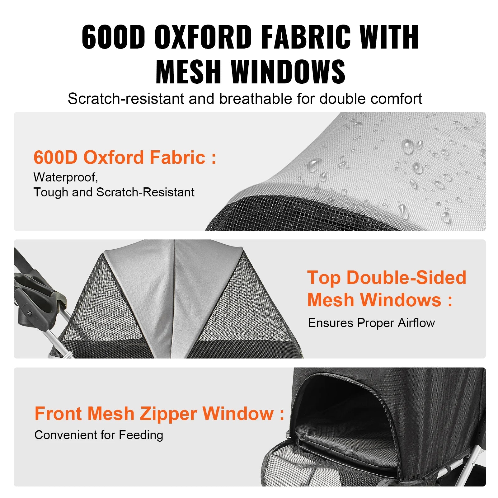 Multiple mesh windows of the dog stroller give your pet a wider field of vision and a closer connection to the outside world. The sturdy 600D Oxford fabric ensures the stroller can withstand the test of time, ensuring safety and comfort even when your pet gets playful.