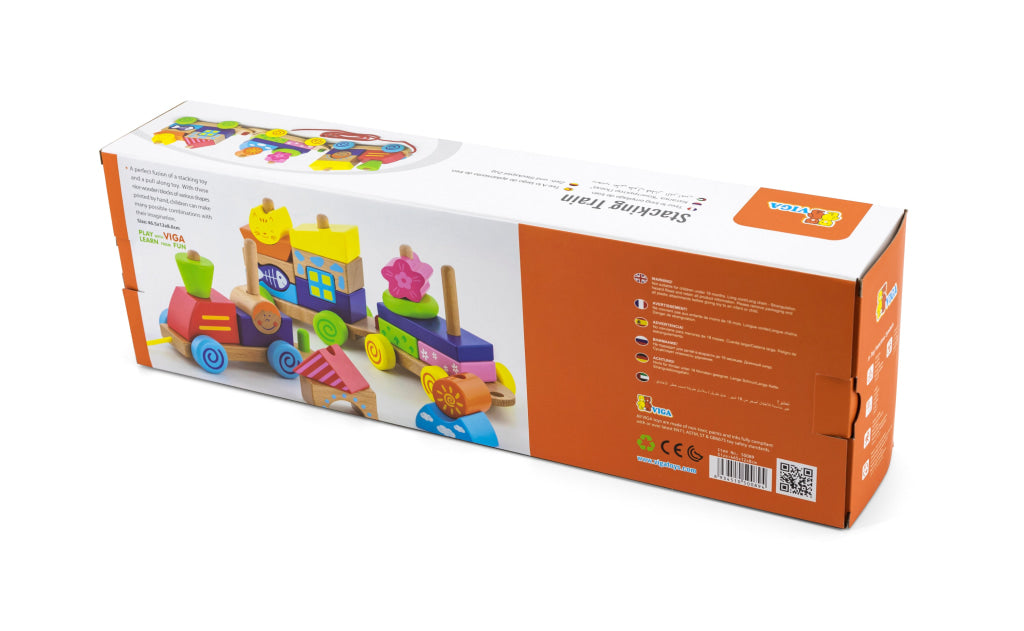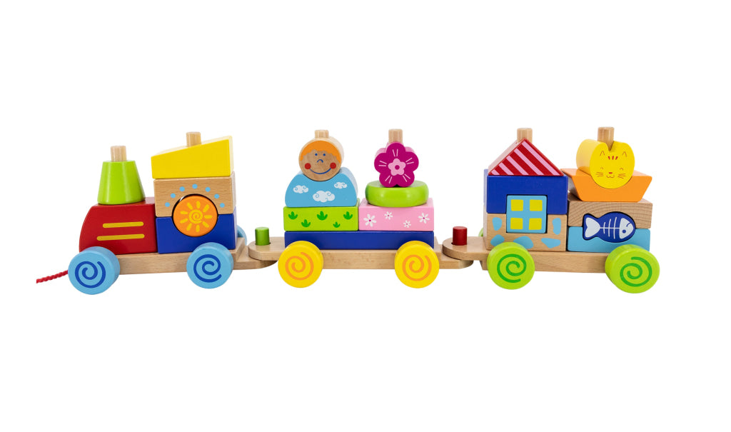 - A fun and vibrant stacking and pull along toy. Beautifully crafted wooden blocks of various shapes printed by hand, children can create as many different style trains as their imagination lets them.