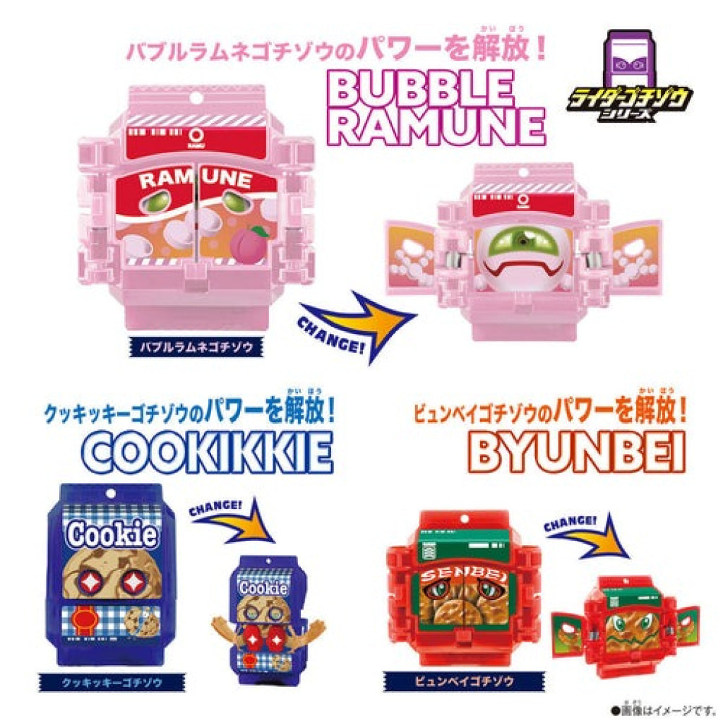 The DX Rider Gochizo Set 03 is ready to make your "Kamen Rider Gavv" transformation dreams come true! It includes the pink Bubble Ramune Gochizo, as well as the Cookie Gouchizo and Byunbei Gochizo. Attach each item to the DX Transformation Belt Gavv to activate each item's special abilities -- place your order today!