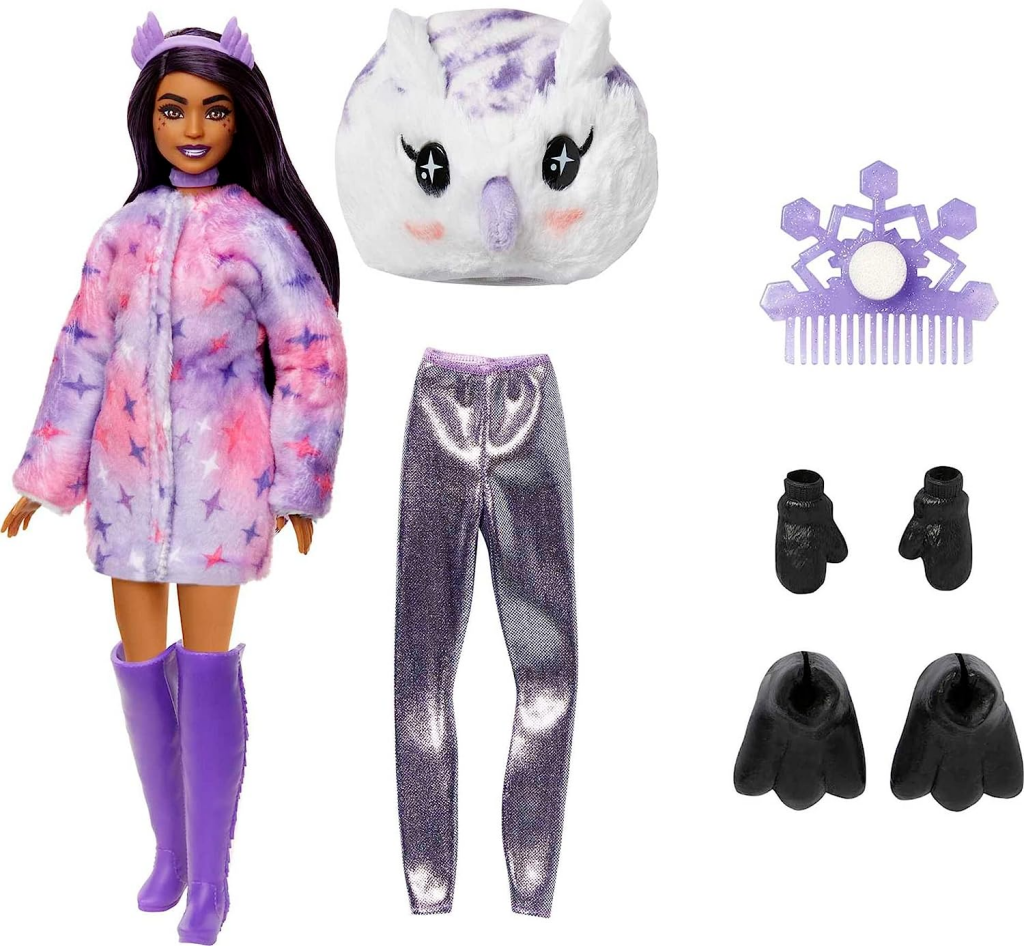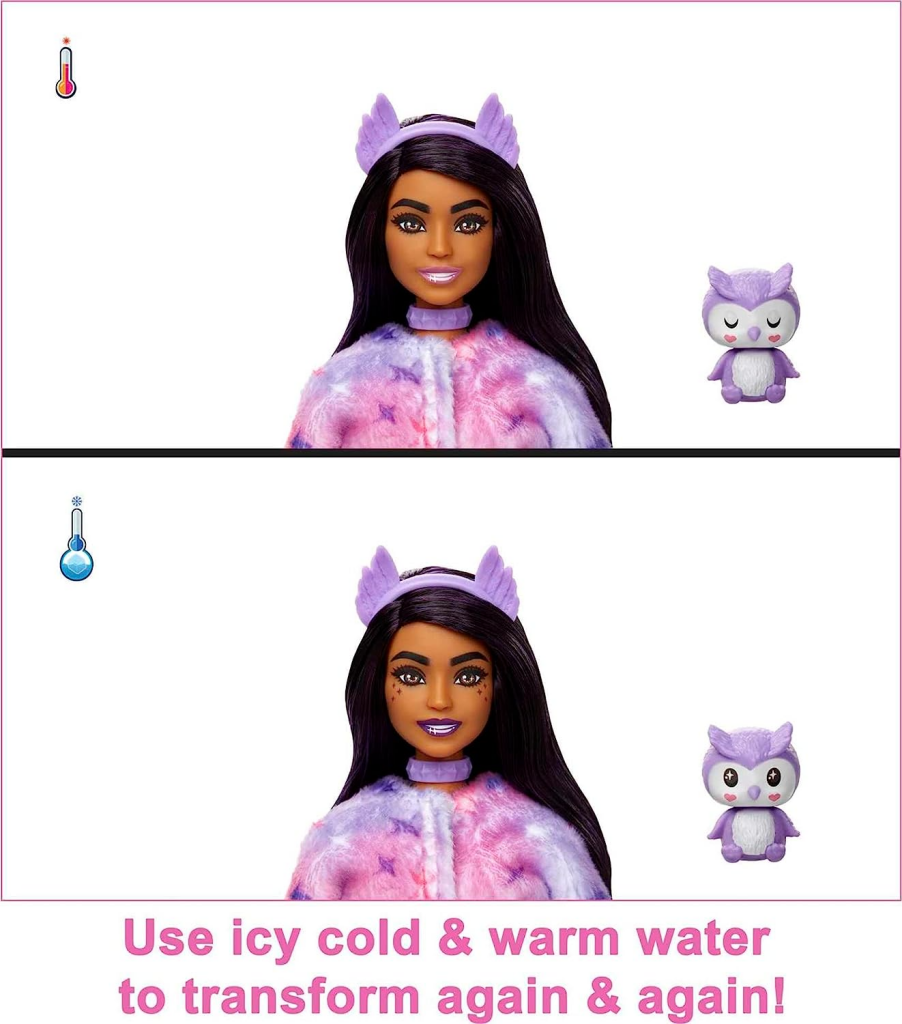 - Kids can dress and accessorize Barbie doll by reversing the costume top to find a super-soft fleece jacket-dress with a starry print. The costume head turns into a bed for the mini owl friend, too..Surprises continue for color-change cuteness -use icy cold water to transform Barbie doll's face with winter snowflake sparkle face paint and to "open and close" the mini owl's eyes. Change back with warm water. Repeat again and again!.