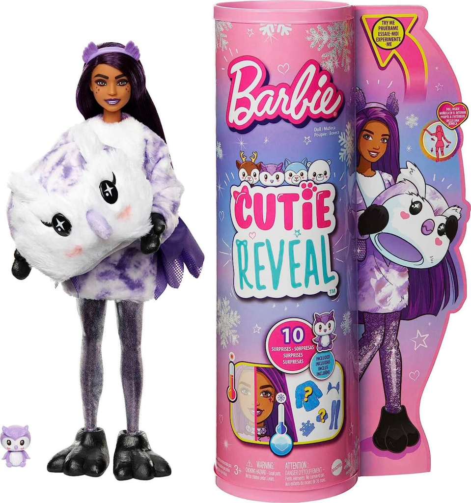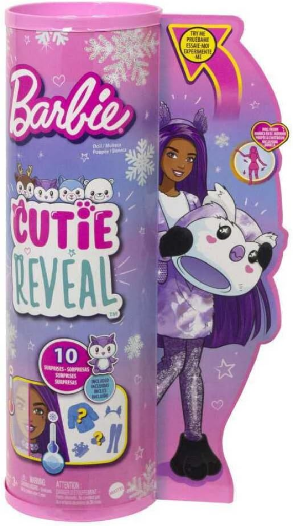 - With 10 surprises in 1 package, the Snowflake Sparkle Series of Barbie Cutie Reveal dolls deliver the cutest unboxing experience with plush winter animal friends and fashions, surprises and transforming fun (each sold separately, subject to availability).
