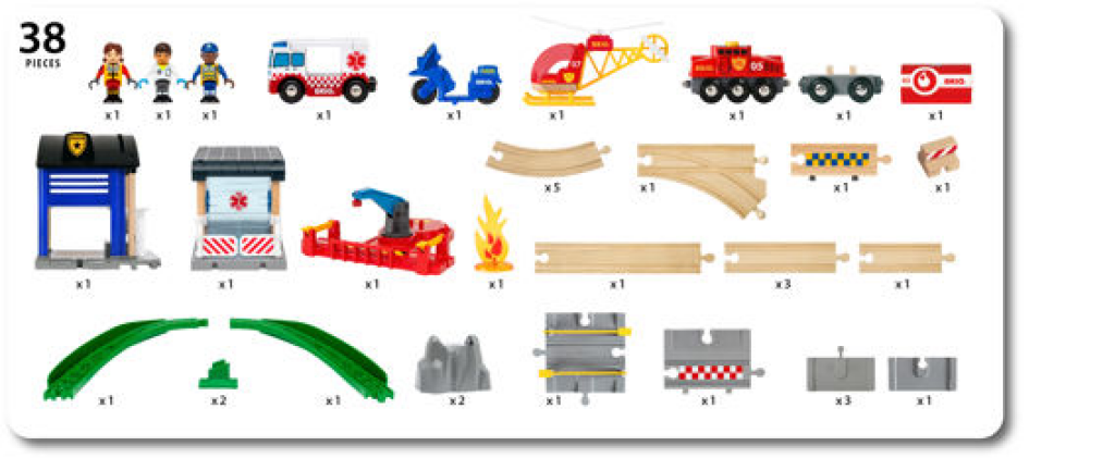 36025 includes 44 pieces; 1x Police Station, 1x Police Motorcycle, 1x Hospital Garage, 1x Ambulance, 1x Fire-Rescue Train, 1x Fire-Rescue Helicopter, 3x Emergency Services Characters, 2x Ascending Curve Tracks, 2x Mountain Train Supports, 13x Wooden Railway Tracks & Switches, 1x Platform Track with Crane, 1x Road/Rail Crossing and Accessories.