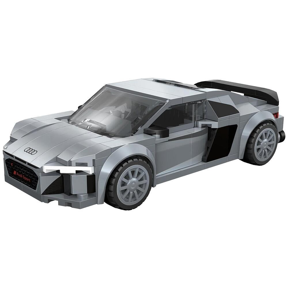 Officially licensed Audi R8 Coupe scale brick model with silver colour and printed pieces. A faithful 1:24 replica of Audi's mid-engined two-seater sports car that was in production from 2006 to 2024, it can manually move forwards and backwards and is ideal for play and display.
