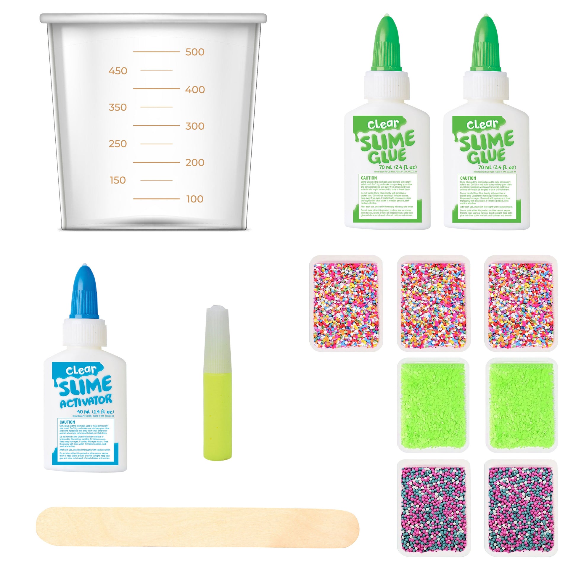 • Kit includes 24-page book, measuring cup, slime glue, slime activator, glow-in-the-dark paint, polymer clay sprinkles, glow-in-the-dark sprinkles, rainbow foam balls and a stirring stick.