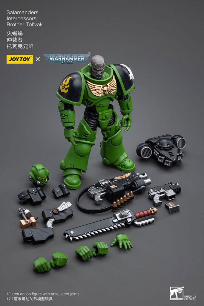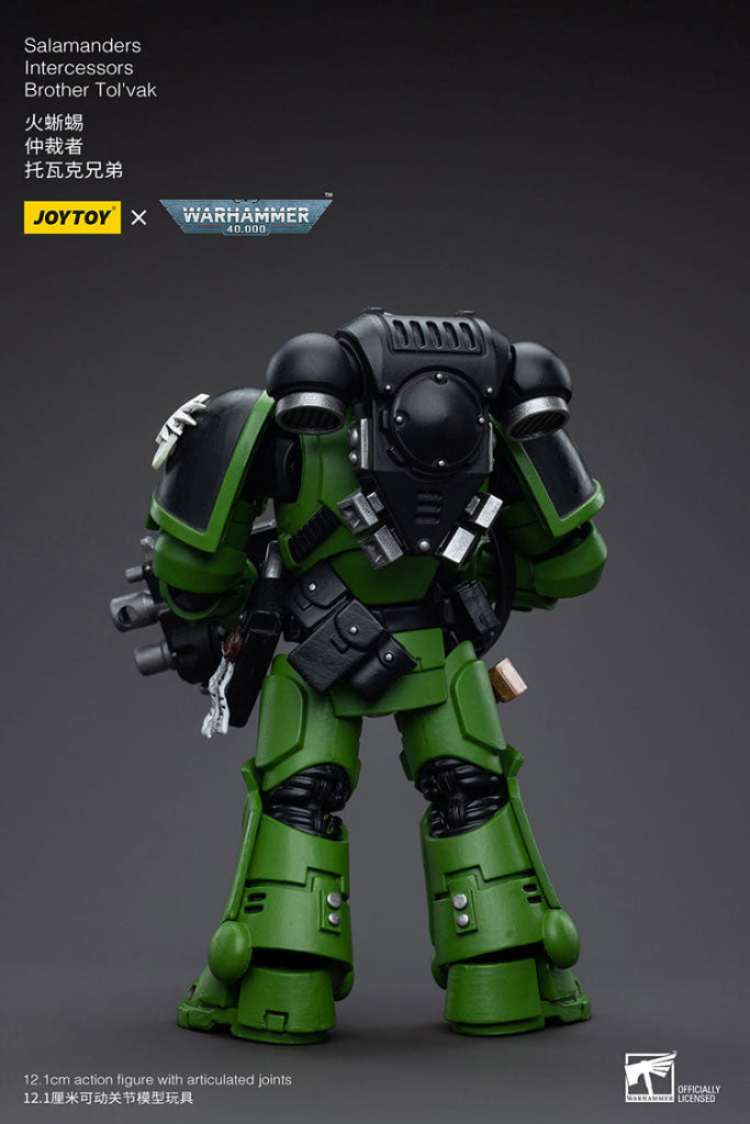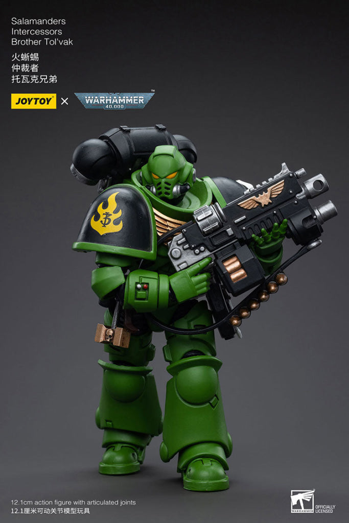 The JoyToy Action Figure Warhammer 40K Salamanders Intercessors Brother Tol’vak is a miniature figurine that is part of the Warhammer 40K tabletop game. The figurine depicts a battle-hardened warrior with a muscular build, clad in ornate power armor, and in a dynamic stance, ready to charge into battle and strike down his foes.